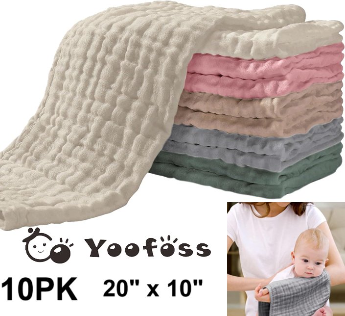 10PK yoofoss absorbent 100% cotton baby burp/wash clothes machine washable - 20"x10" - multicolor