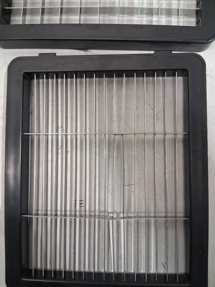There is a bend on a metal piece of one grater and then a corresponding bend on the the piece of the product used to smash down vegetables.