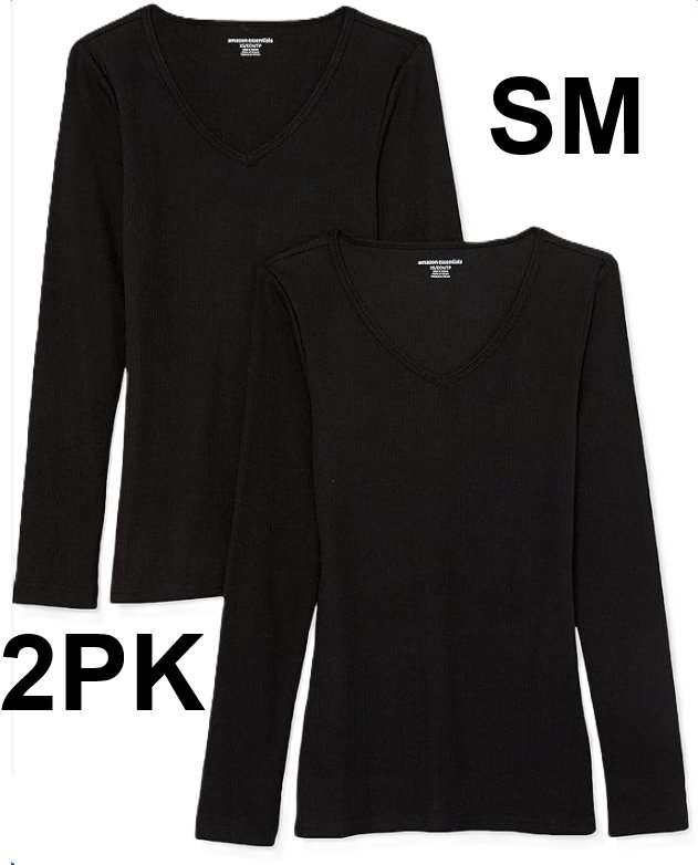 2PK Women's Amazon Essentials Slim-fit Layering Long Sleeve Knit Rib V-Neck - small - black - (style:aew30292f23)