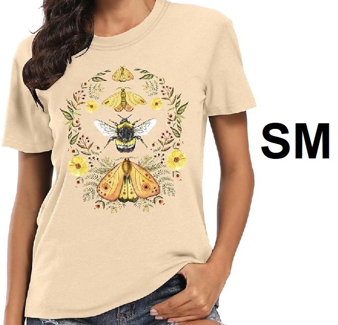 women's short sleeve crew neck Moon Moth Flower Botanical Bee Print Tee - small - yellow