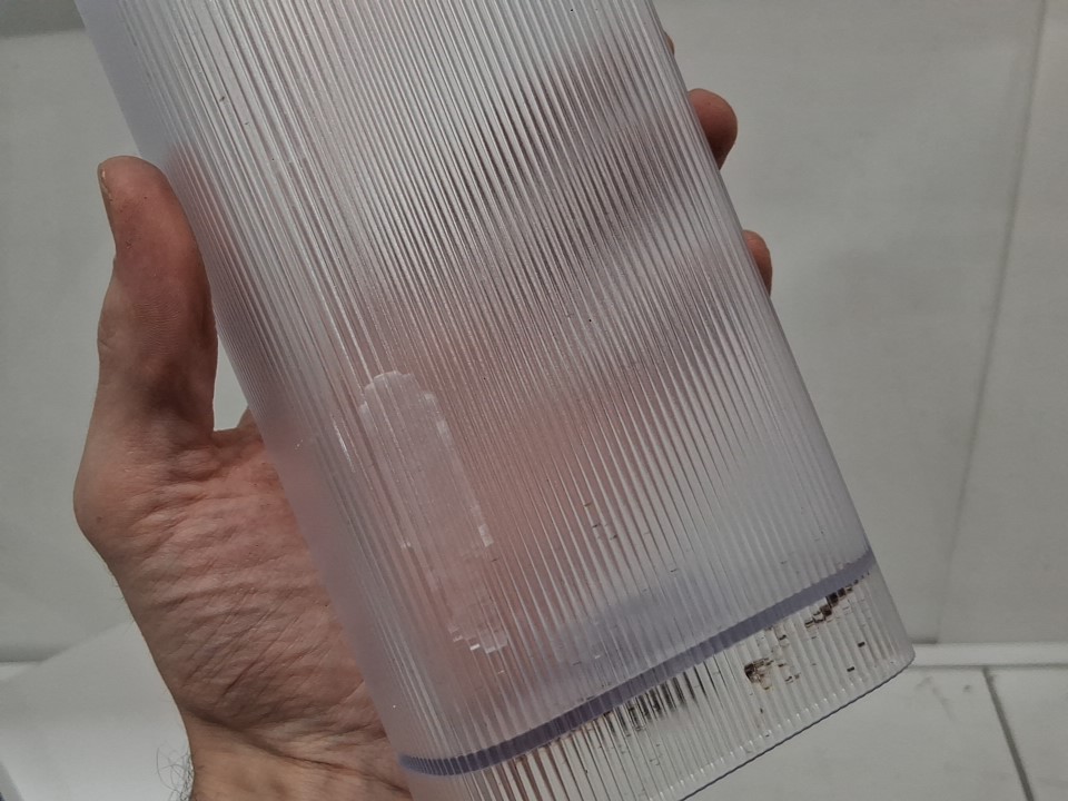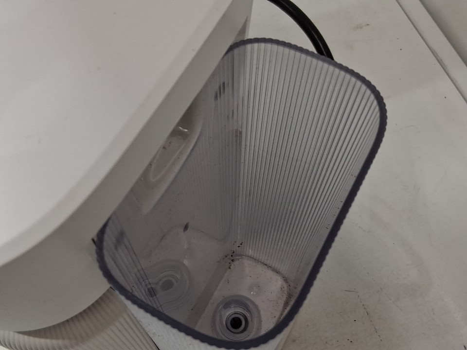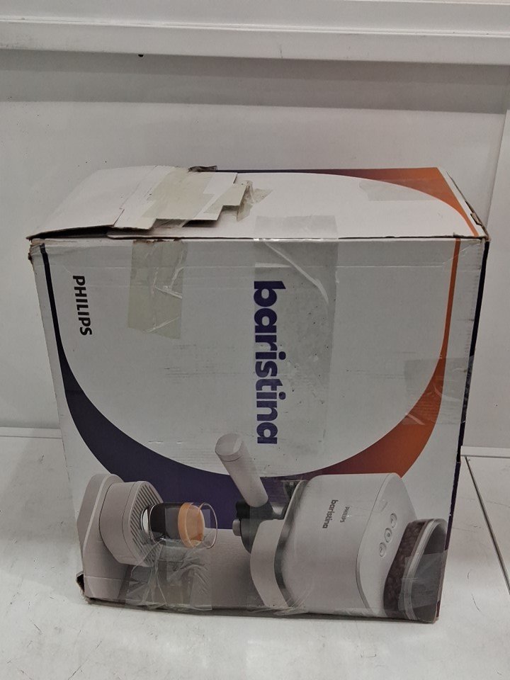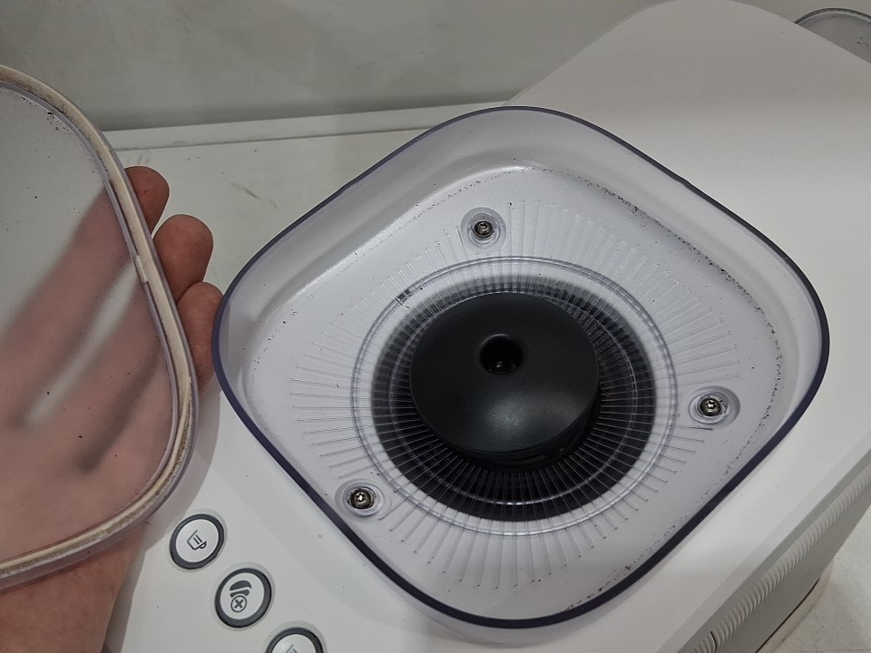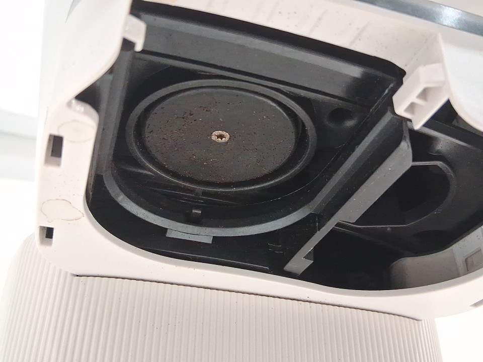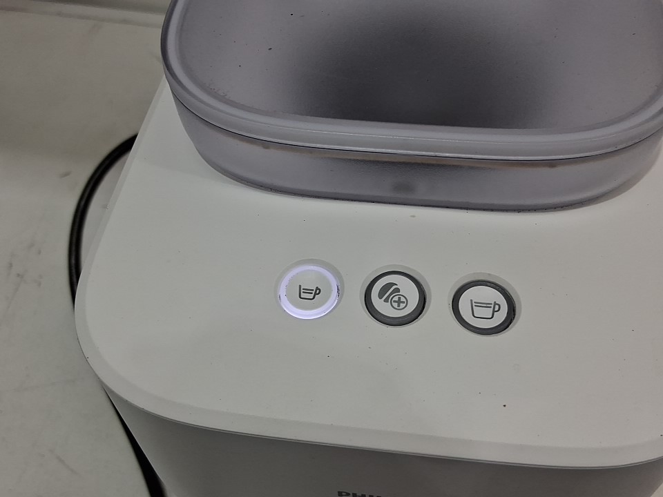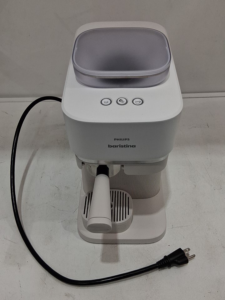 **Tested for power.** Item has minor coffee grounds debris throughout the machine and its components, small chip in the lid for the water reservoir from previous gentle use, see photos.