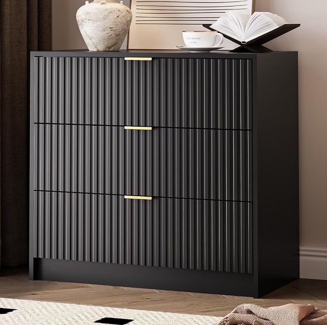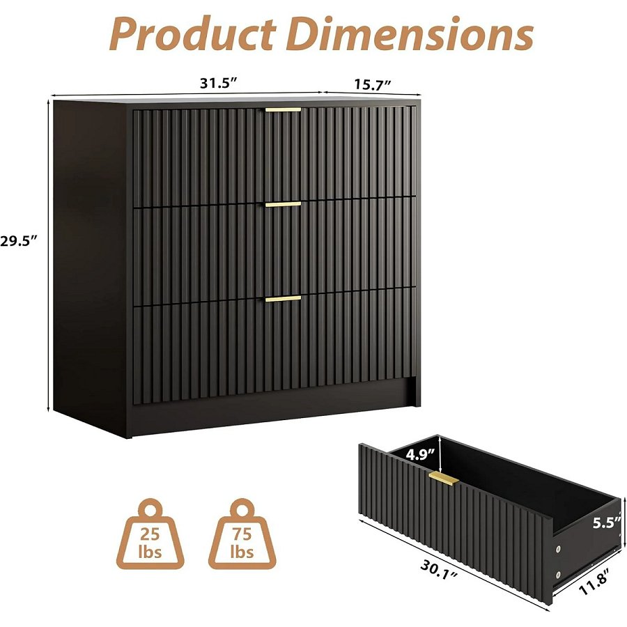 FURNIWAY Black 3 Drawer Fluted Dresser - 32" - black (model: mht-f11014bk)