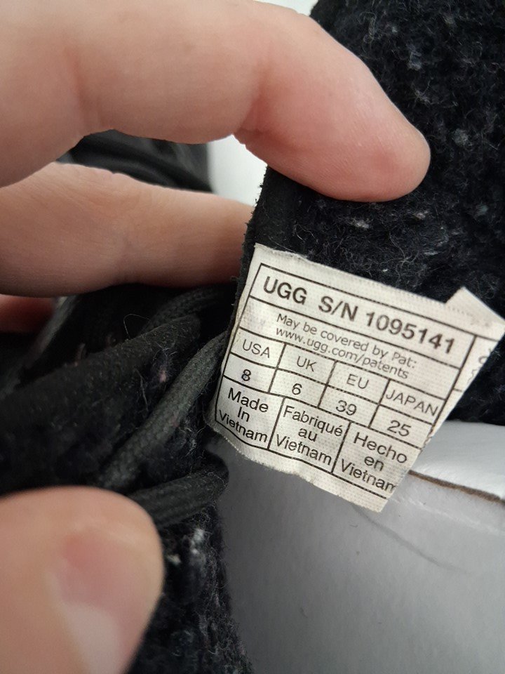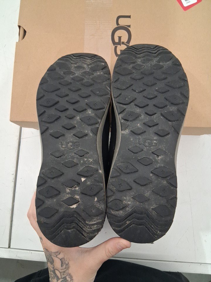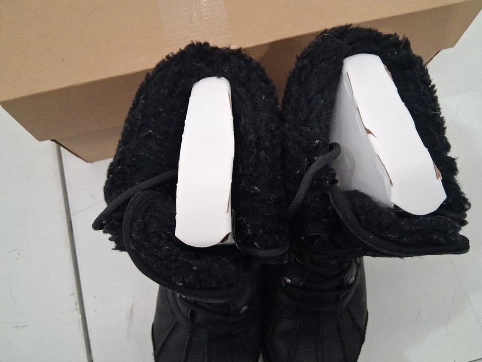 Boots have dirt discoloration spots on toes, sides of soles and on soles. Tags are faded and fabric on inside is pilling