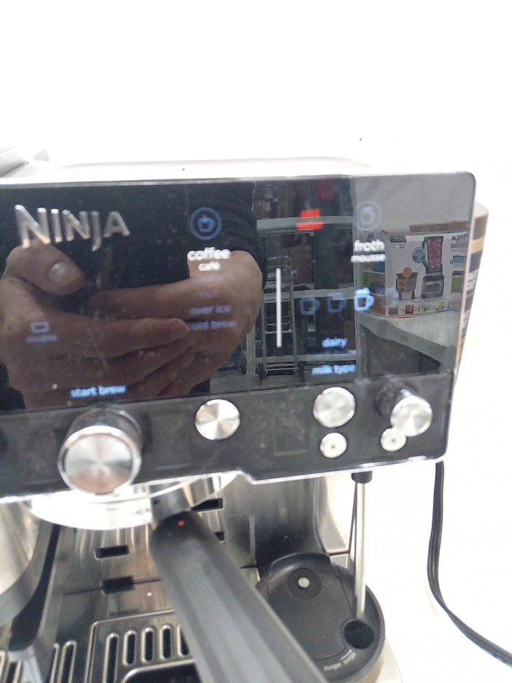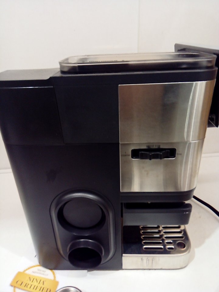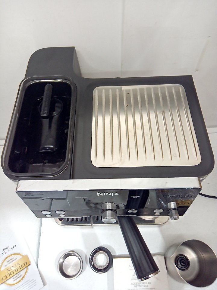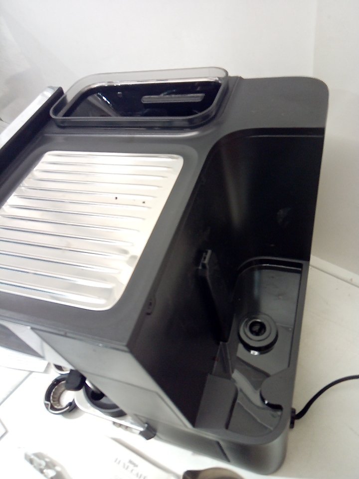 The metal cover plate for the front buttons has come off and is bent. Ours is missing the rear tank, a cover piece for the top left area and the flat piece that inserts into the middle of the front under the portafilter. There are scratches and markings on the outside of the machine. Tested for power. (SEE PHOTOS)