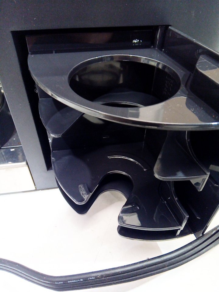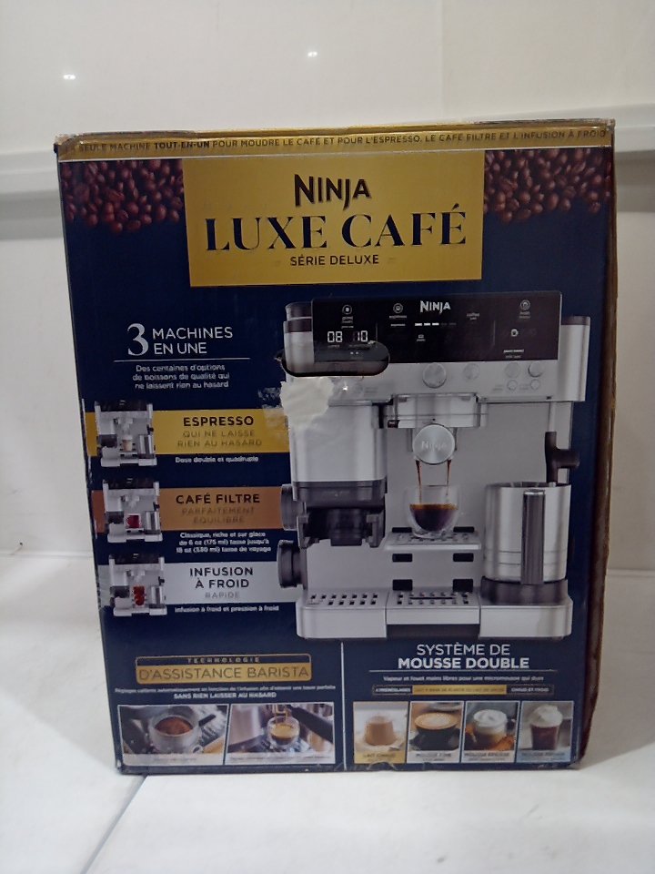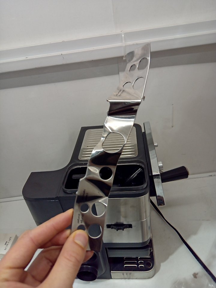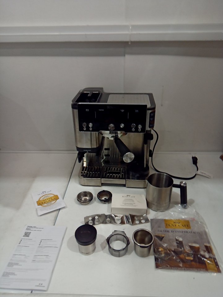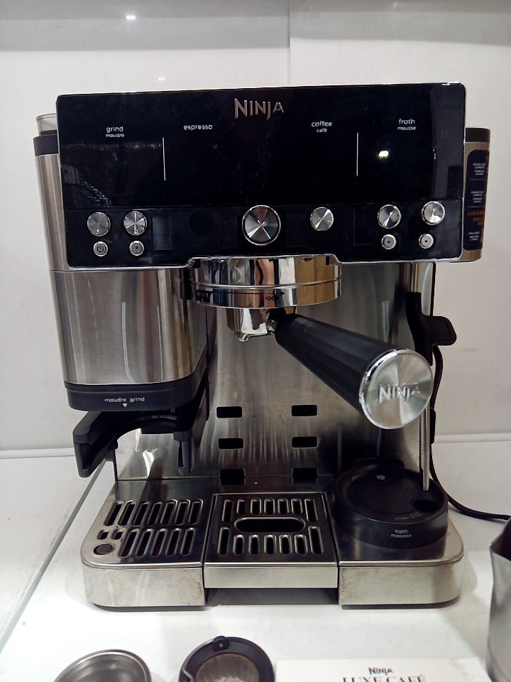 The metal cover plate for the front buttons has come off and is bent. Ours is missing the rear tank, a cover piece for the top left area and the flat piece that inserts into the middle of the front under the portafilter. There are scratches and markings on the outside of the machine. Tested for power. (SEE PHOTOS)