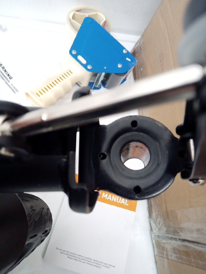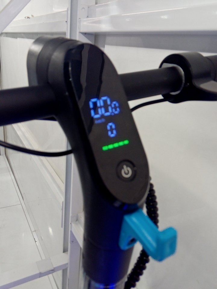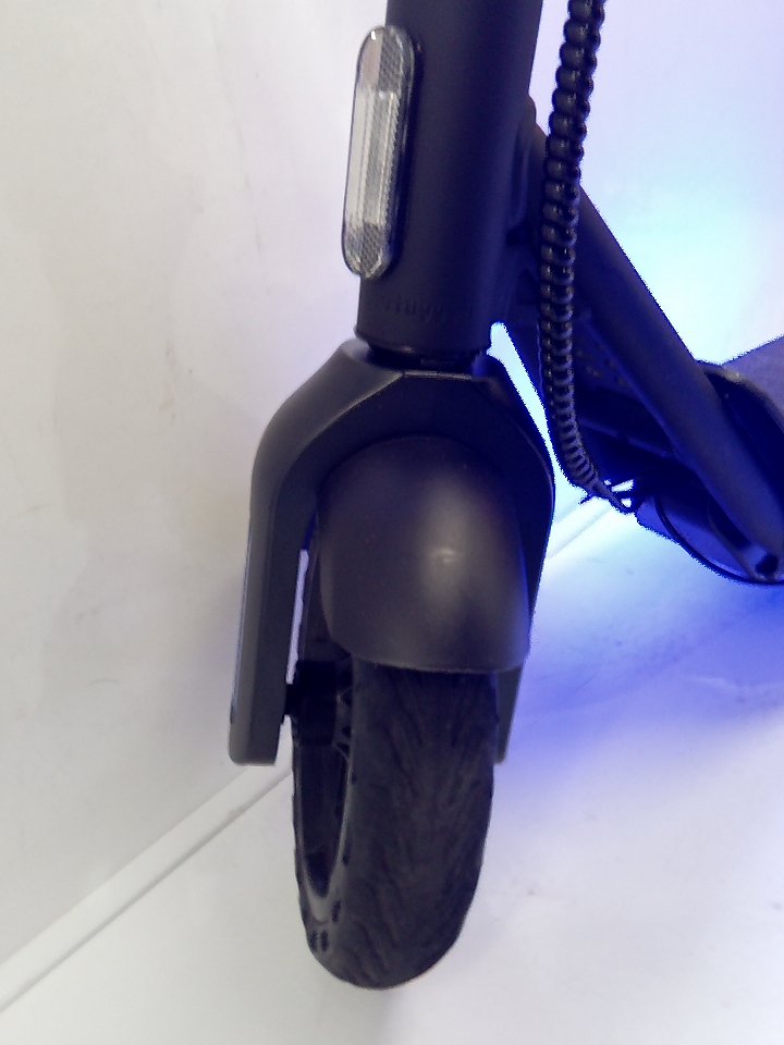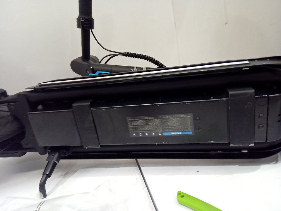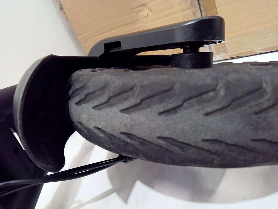 There are scratches, scuffs and dirt on the bottom and sides of the deck and the wheels. Ours is missing a piece that secures the handlebar column in place, so it could not be test driven. In order to use this scooter, you will need to purchase this piece separately. An example of the missing piece is circled in red in the second image. (SEE PHOTOS) Tested for power/light. (SEE PHOTOS)