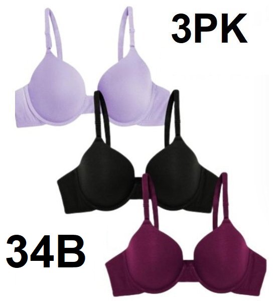 3PK WOMEN'S FRUIT OF THE LOOM UNDERWIRE NON-PADDED T-SHIRT BRAS - 34b - Lilac Whisper/Purple Velvet/Black (model:ft797pk)