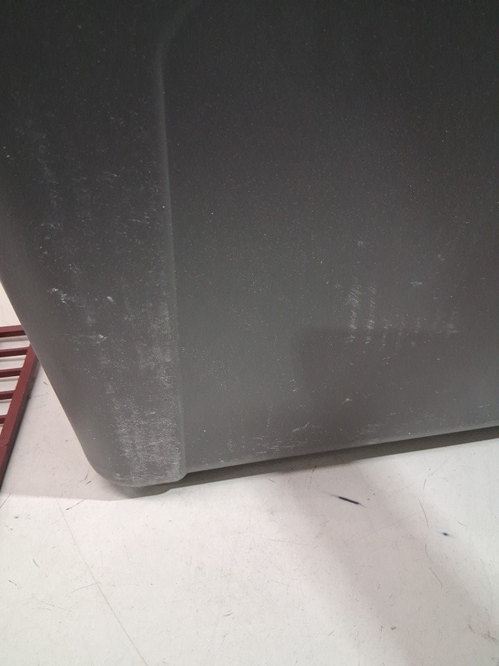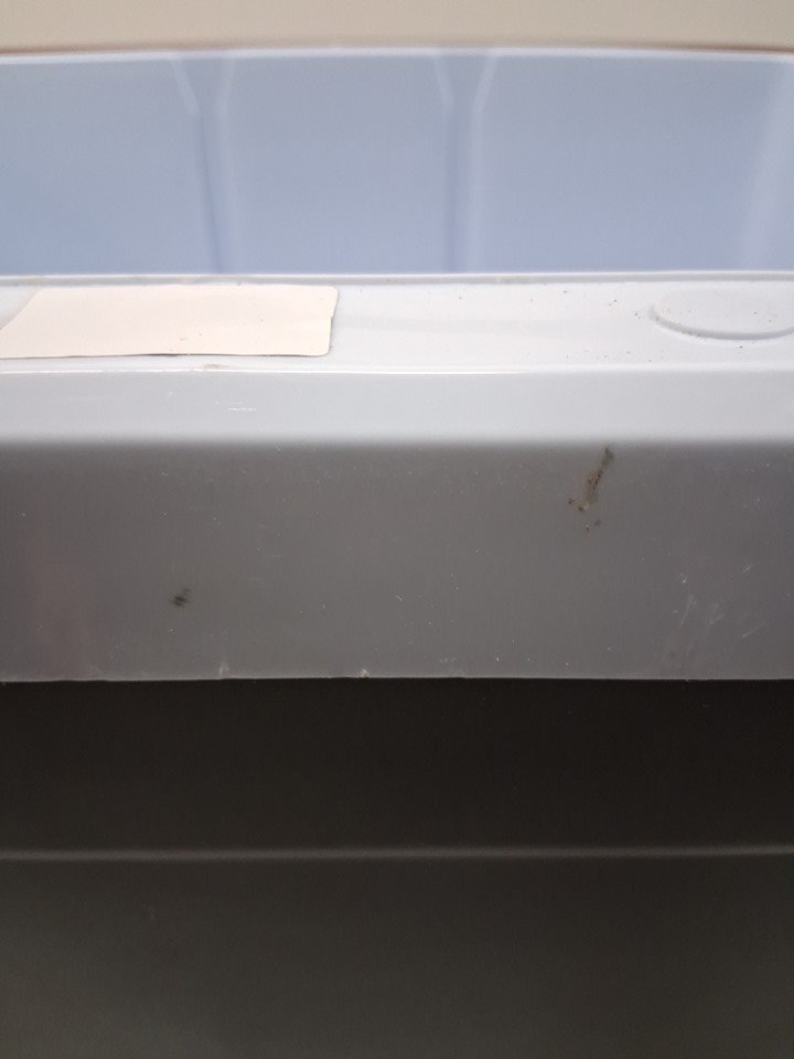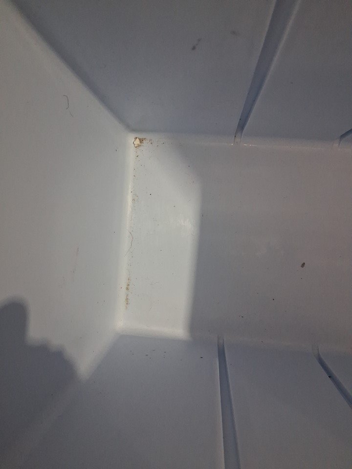 leftover crumbs of debris indicating previous use also some scuff marks on outside surface of product product was tested for power