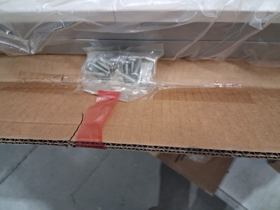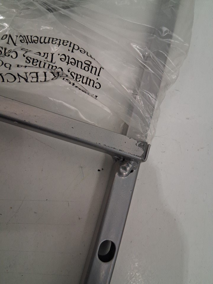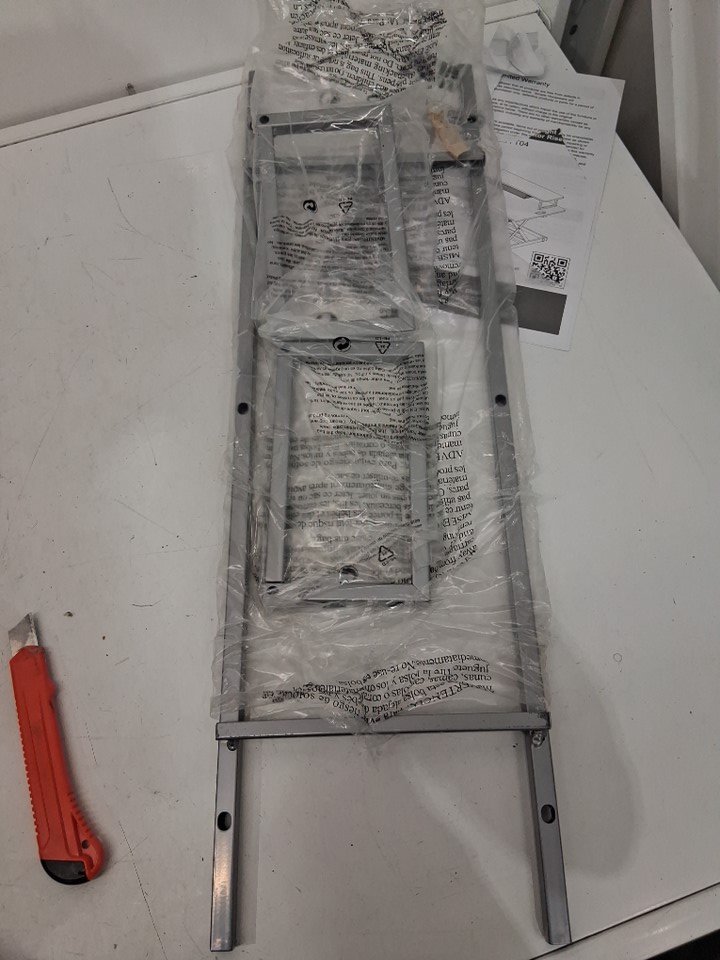 Metal pieces have paint scrapped off from rubbing in shipping. Desk Is still brand new and hardware is sealed to box