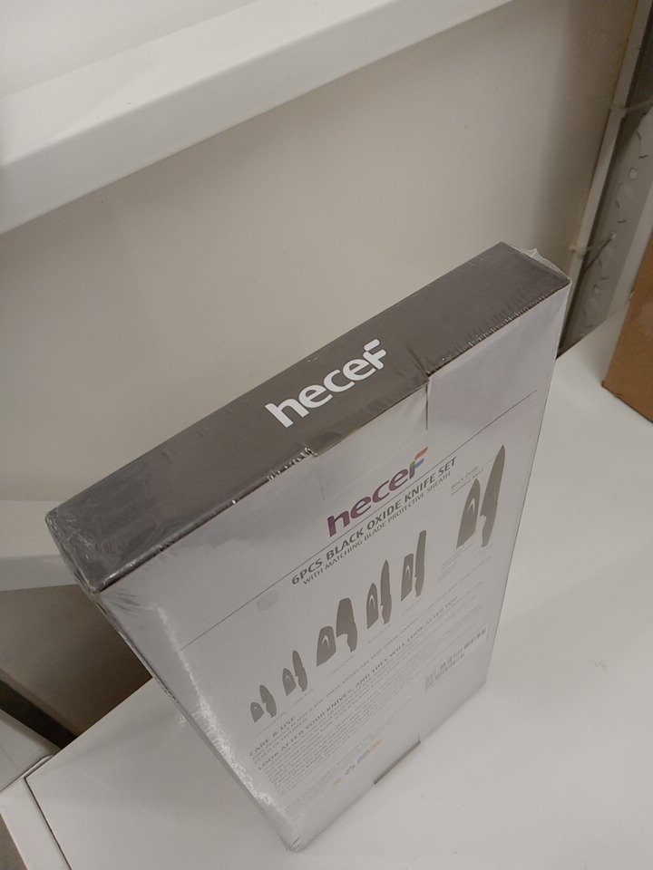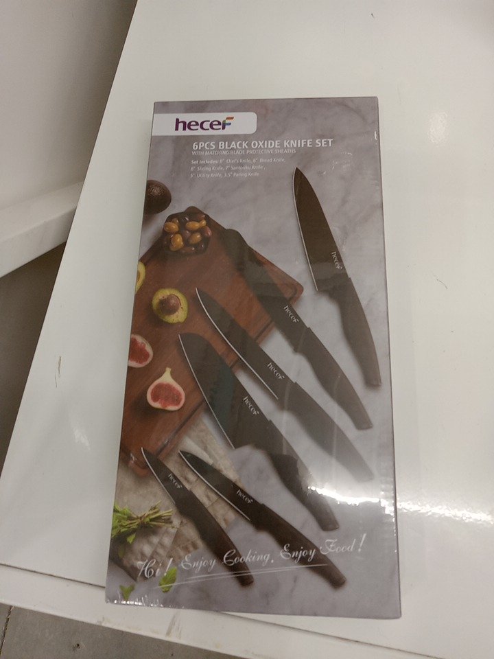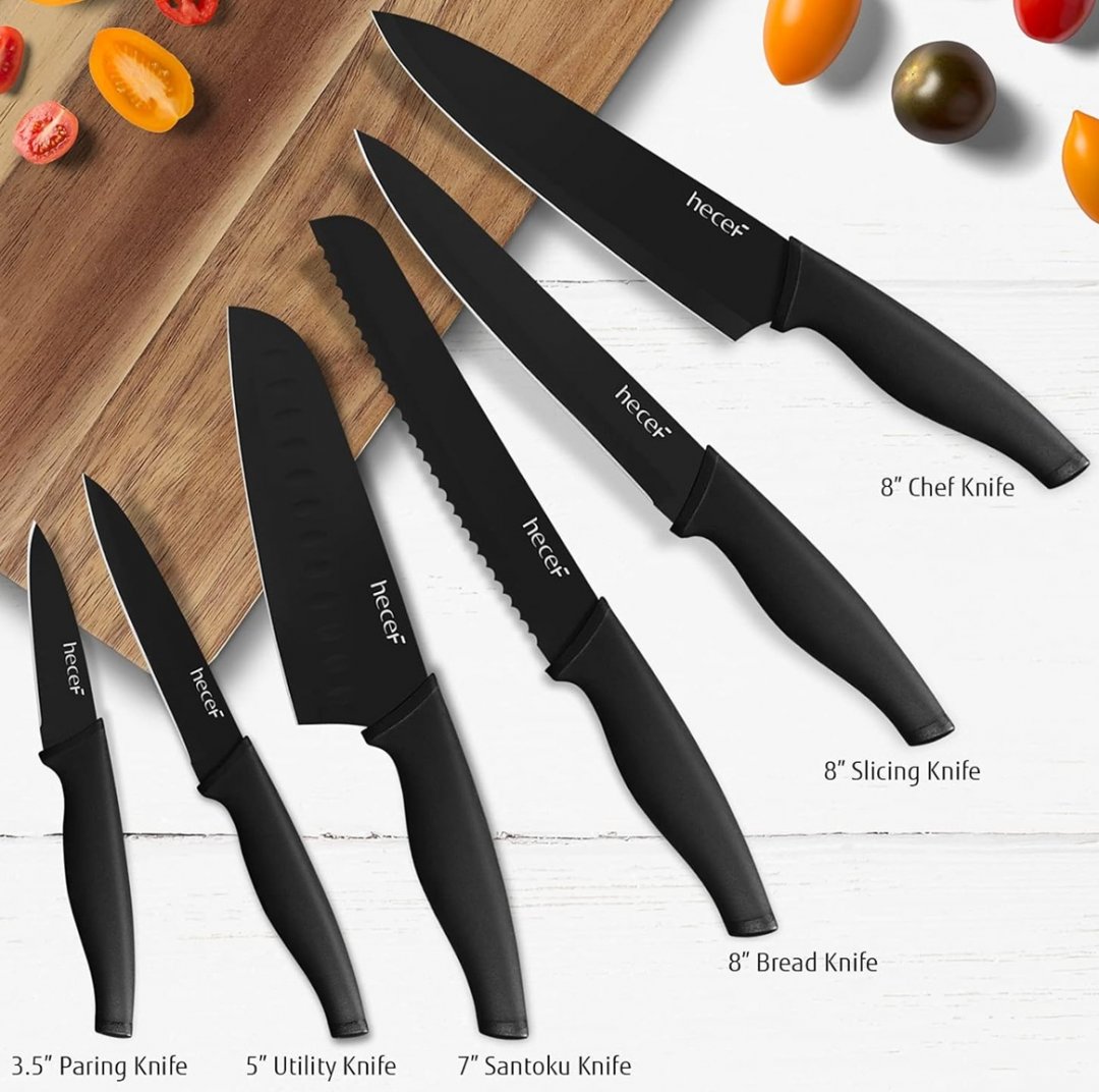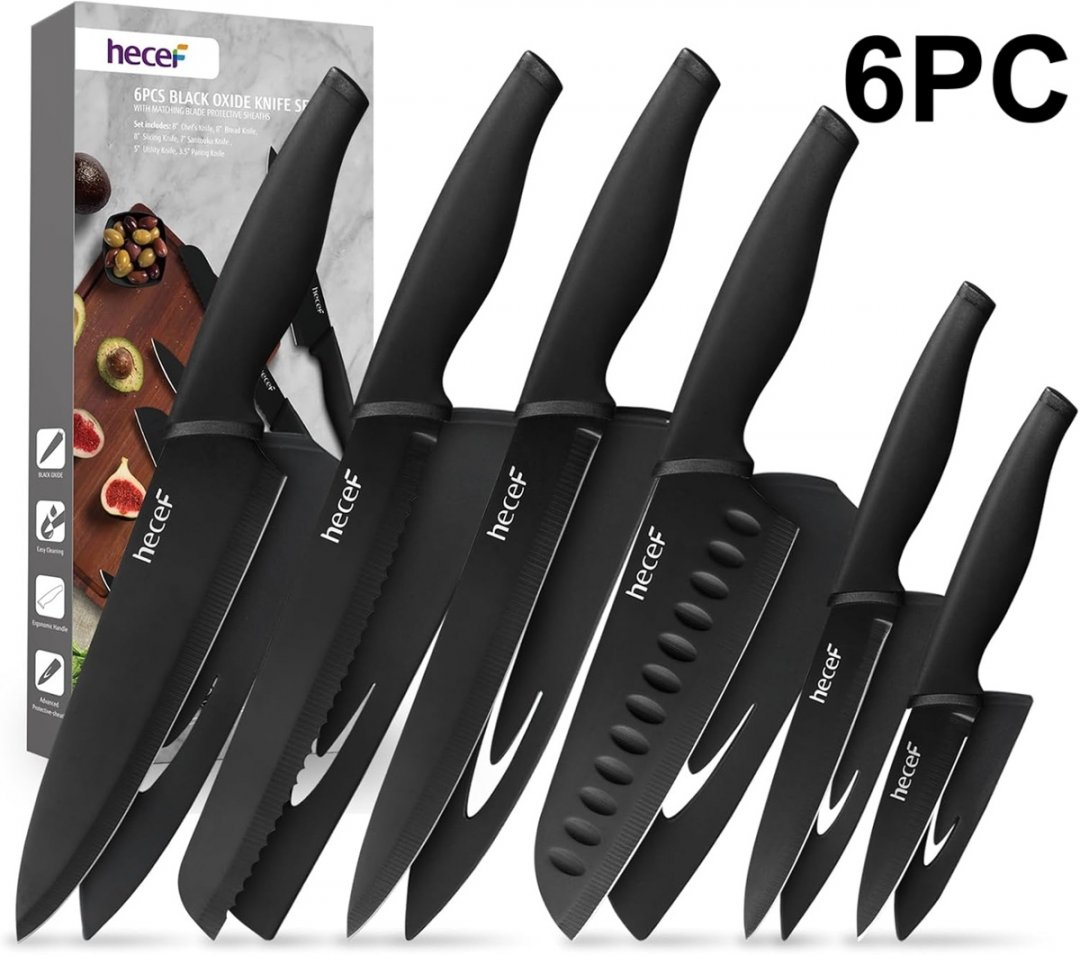 6PC hecef Black Oxide Knife Set with sheaths - 3.5" Paring Knife - 5" Utility Knife - 7" Santoku Knife - 8" Bread Knife - 8" Slicing Knife - 8" Chef Knife - Black (Model: 1)