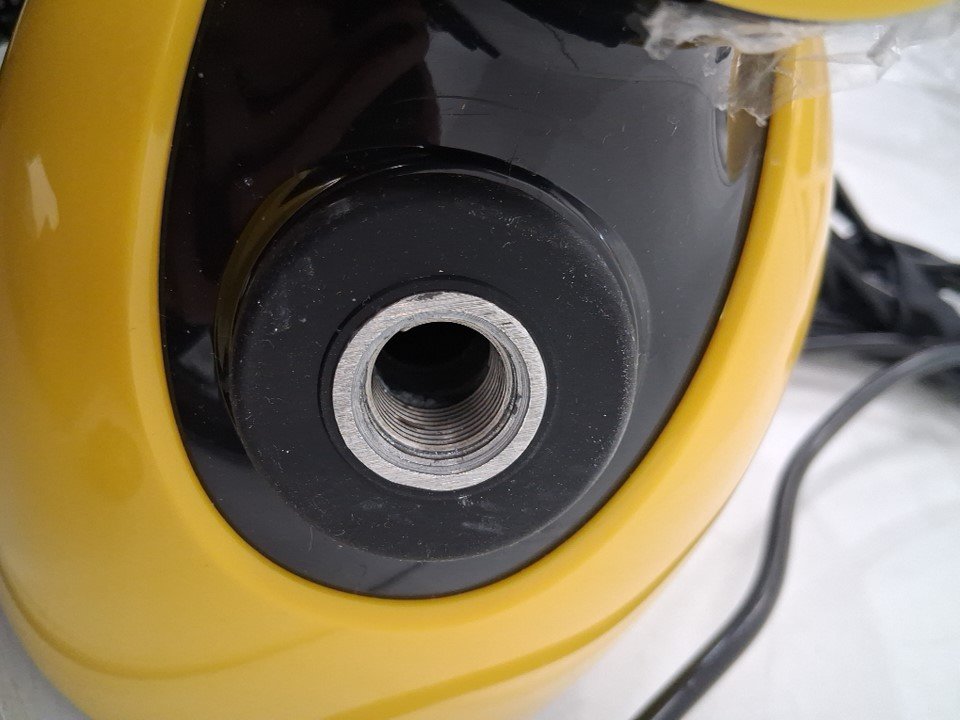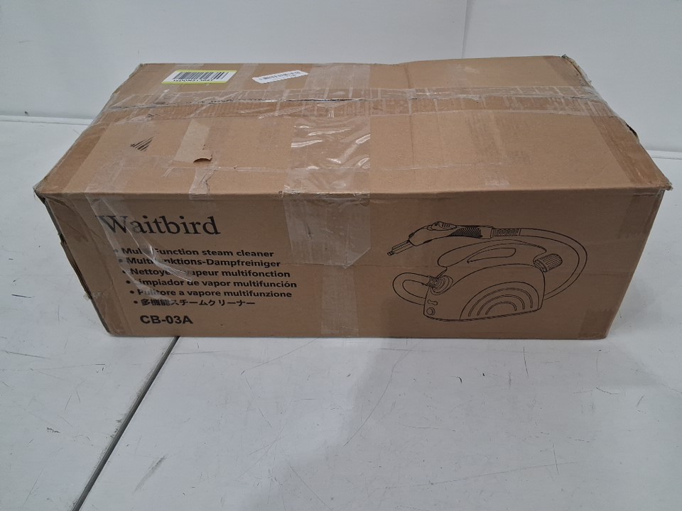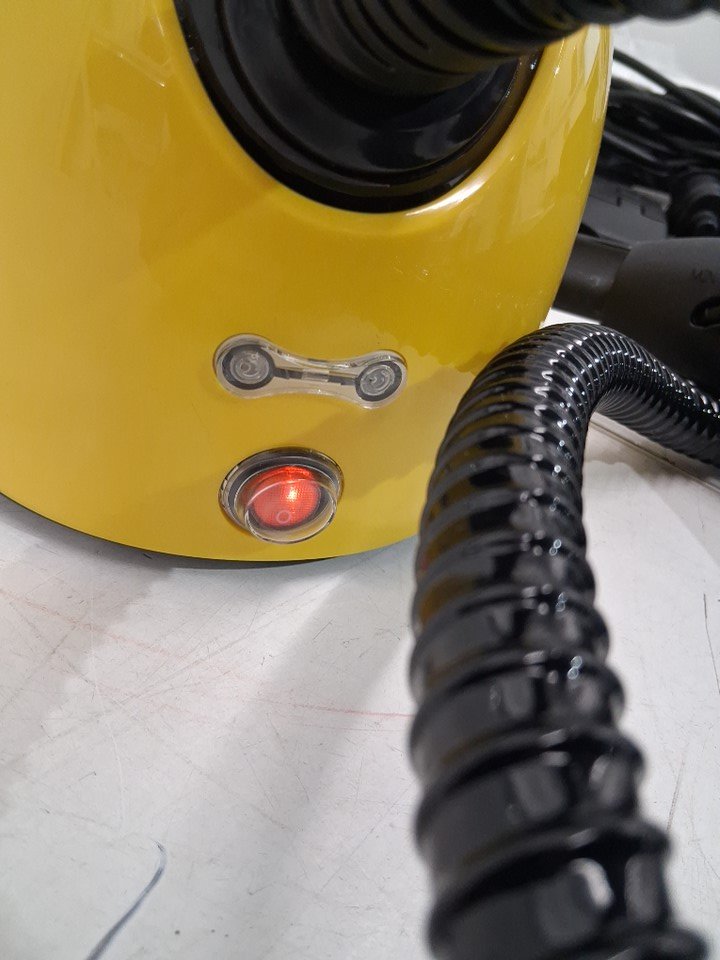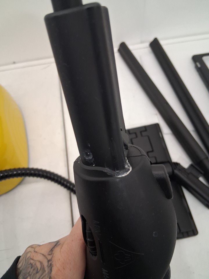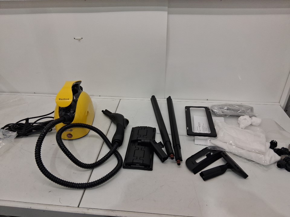 Steamer has some water in chamber, has soap residue on handle and is missing one smaller round white cloth