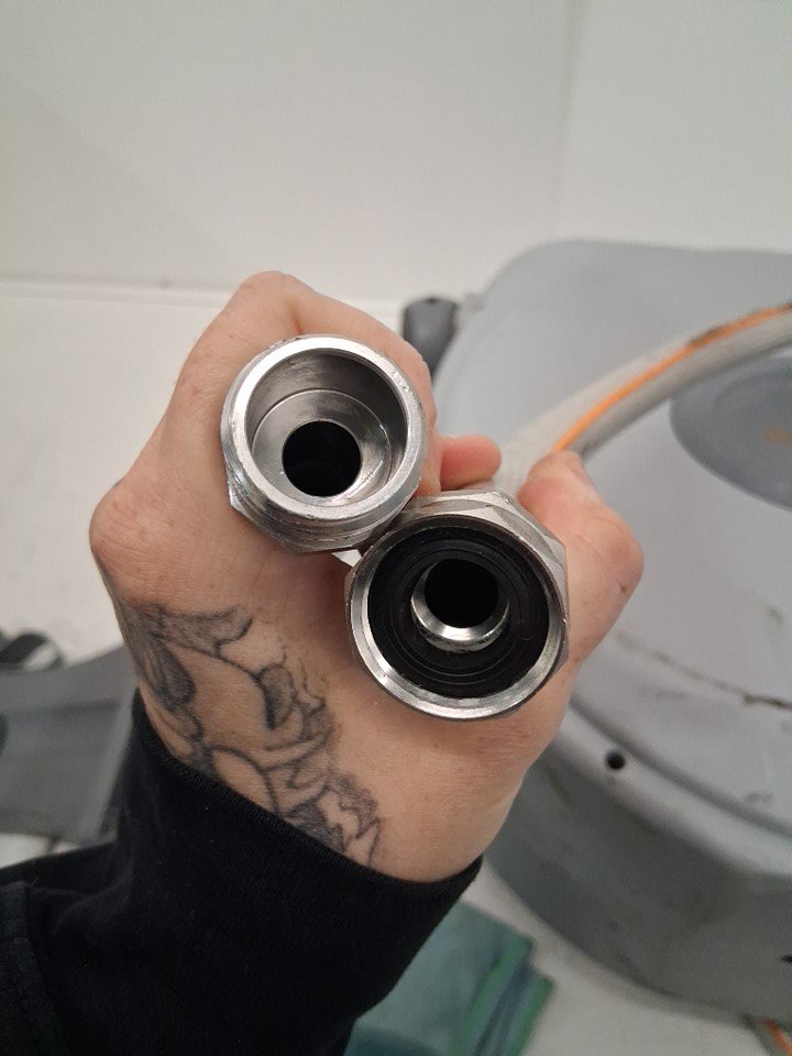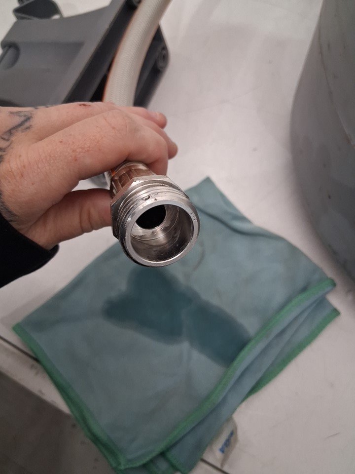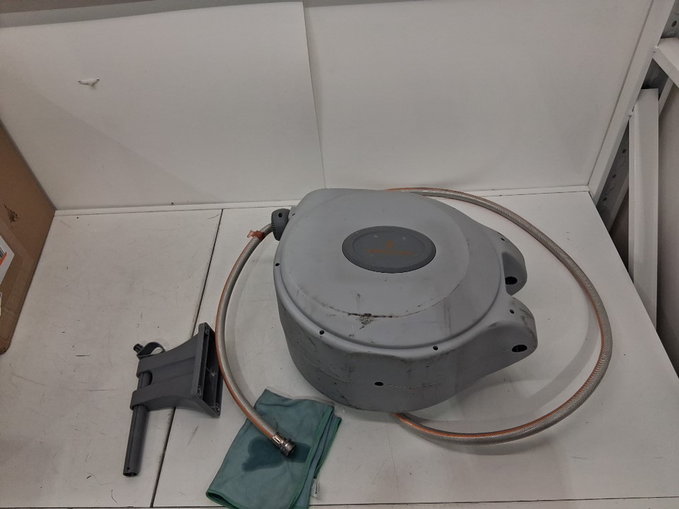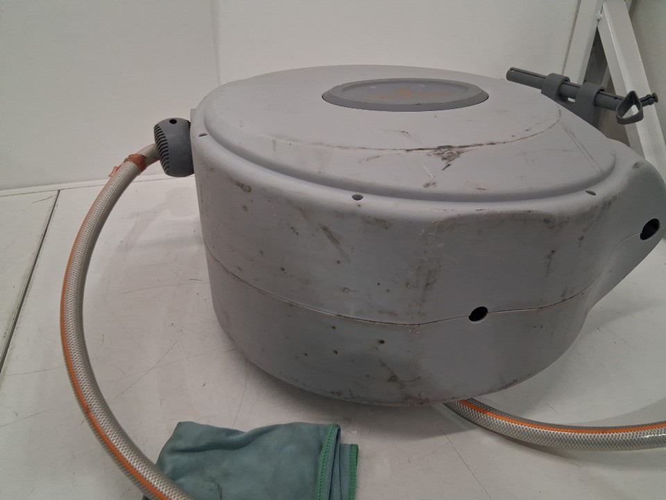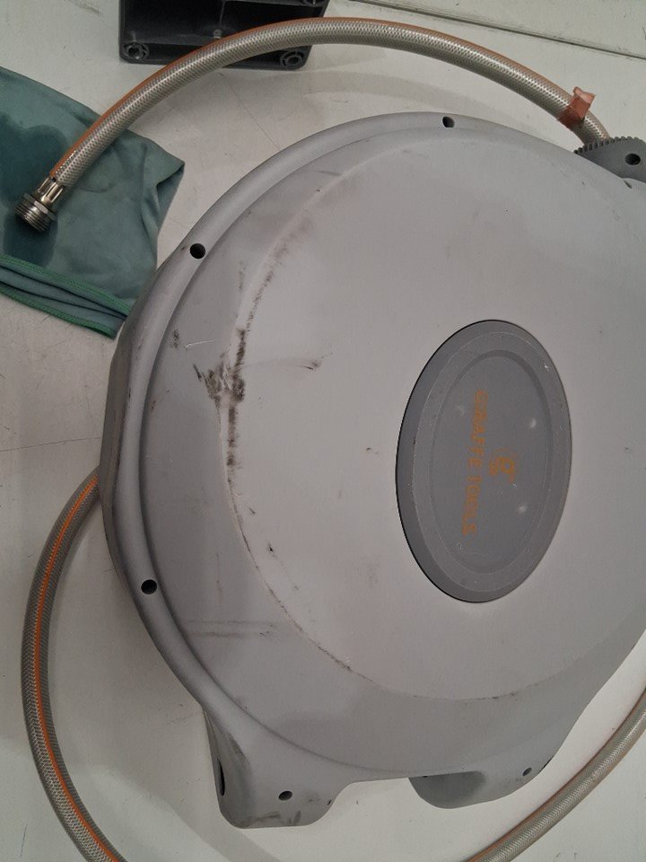 Hose reel still contains water in hose, is covered in dirt and scuff marks. Nozzle is missing and peg for attachment to wall bracket is also missing