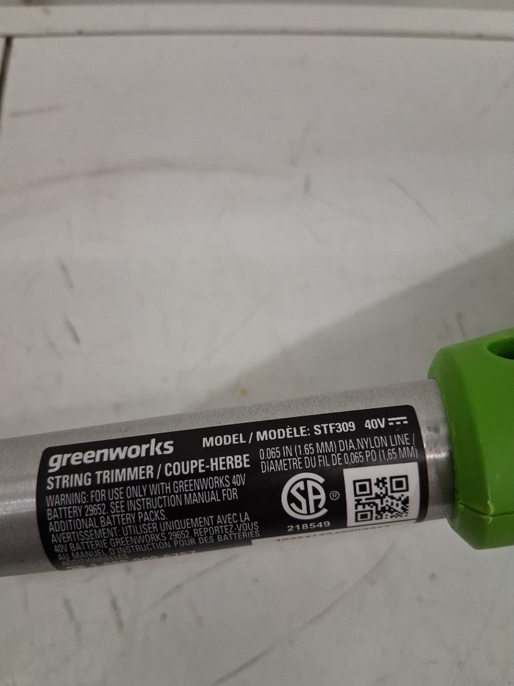 Greenworks Cordless String Trimmer **tool only** - 12" path 40v - green/black (Model: stf309/stf311)
