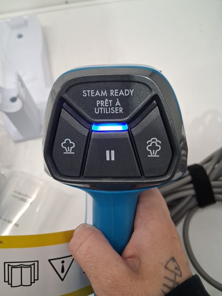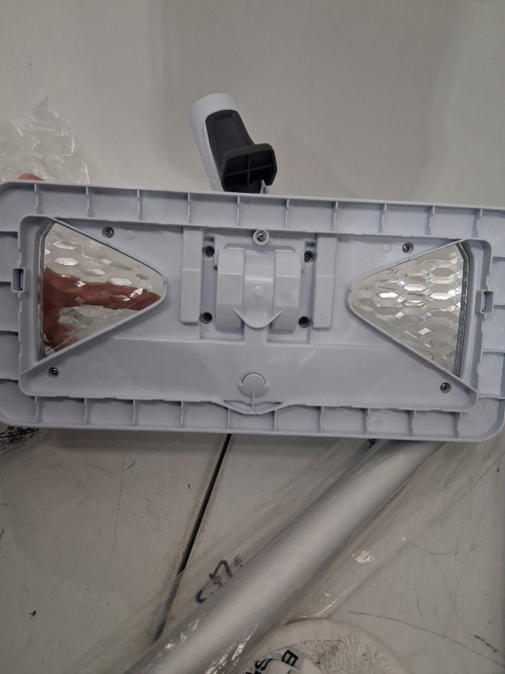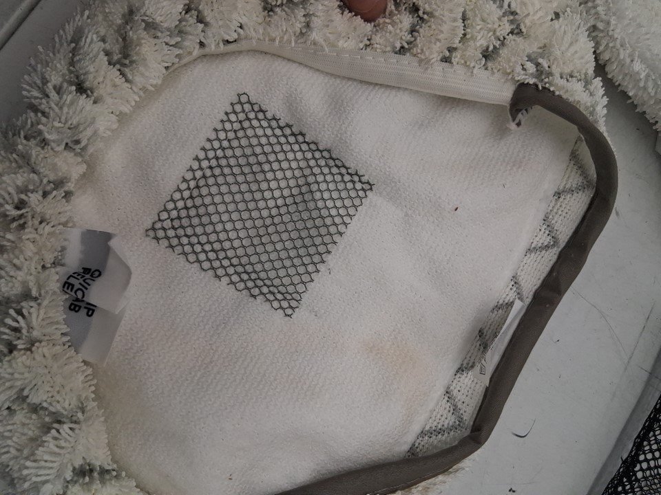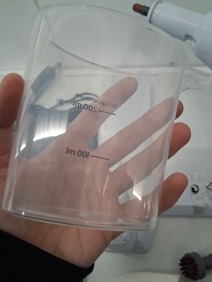 Water chamber and measuring cup have water spots and debris in it, one fabric piece has a stain on it