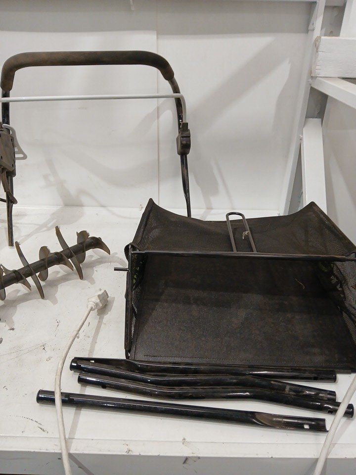 The back flap is disconnected at one end and is being held by tape. All parts are covered in dirt/dust. Tested for power.