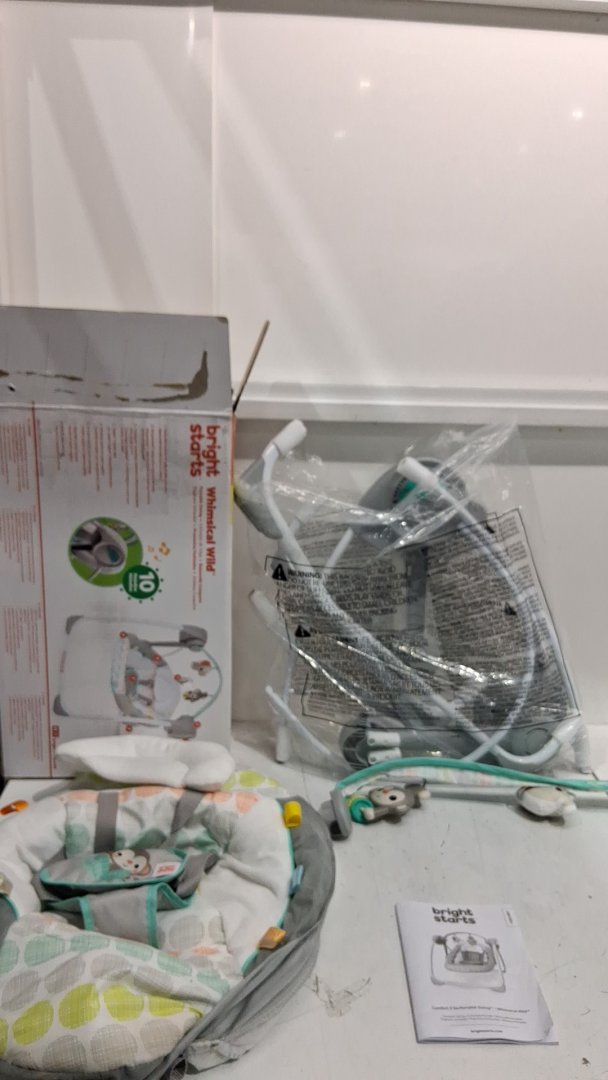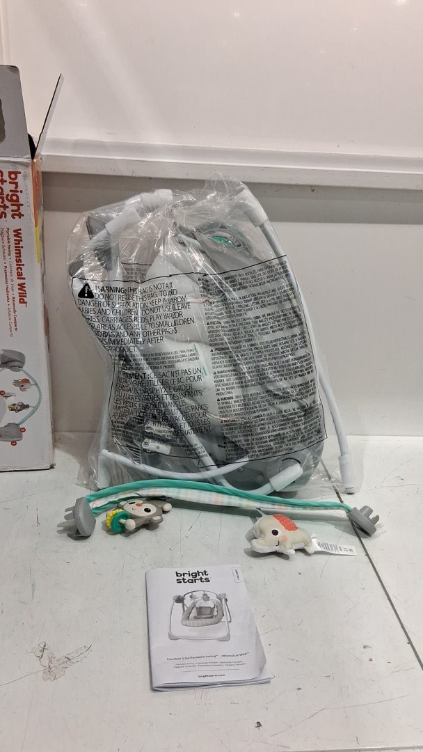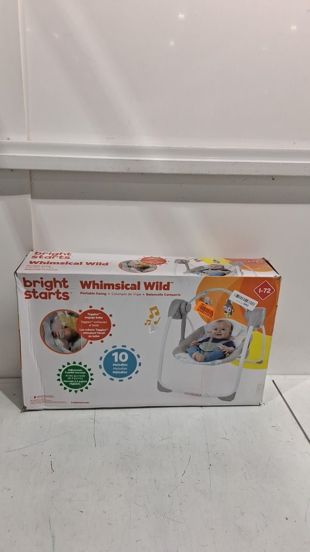 BRIGHT STARTS WHIMSICAL WILD PORTABLE COMPACT AUTOMATIC SWING WITH 10 MELODIES AND ADJUSTABLE HARNESS - MAX 20LBS - WHITE SAFARI ANIMALS (MODEL: 11803-mees)