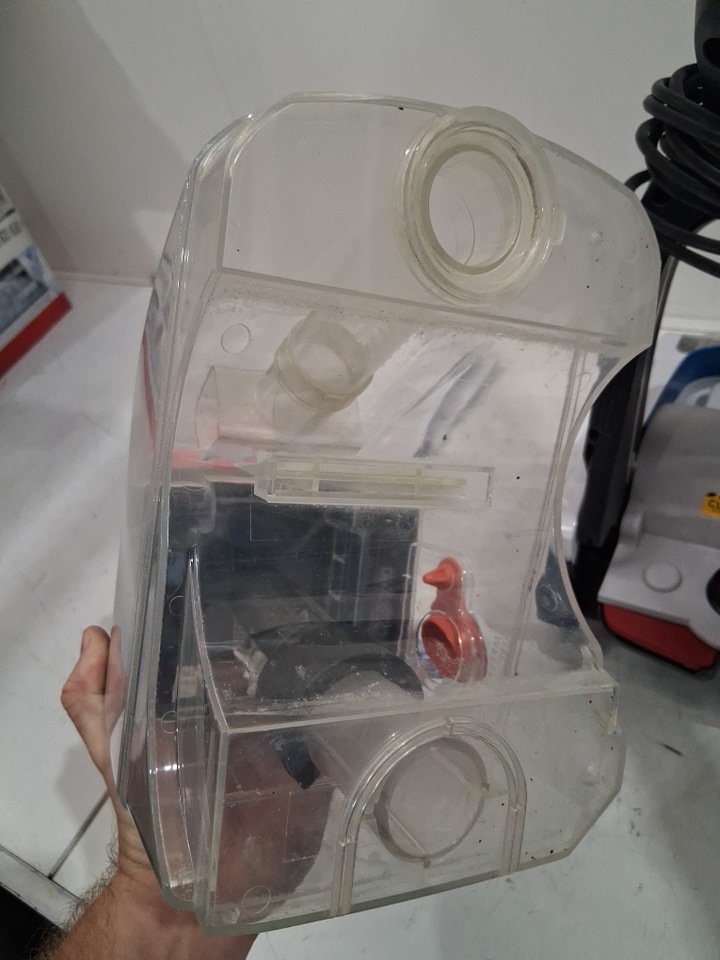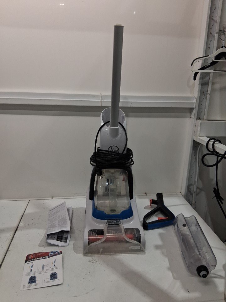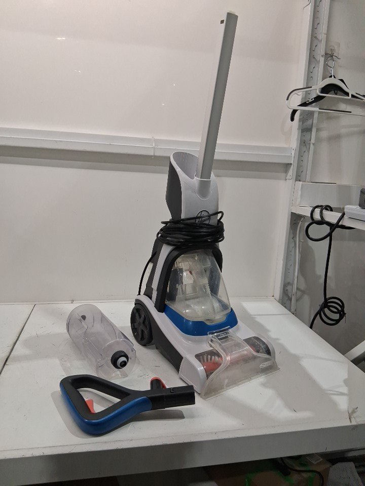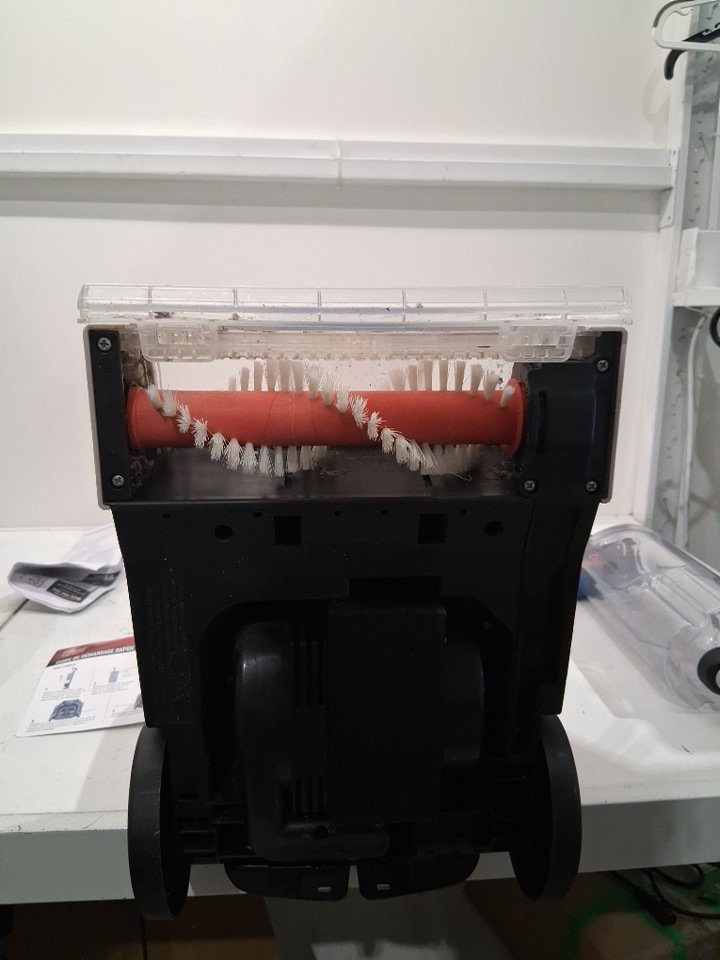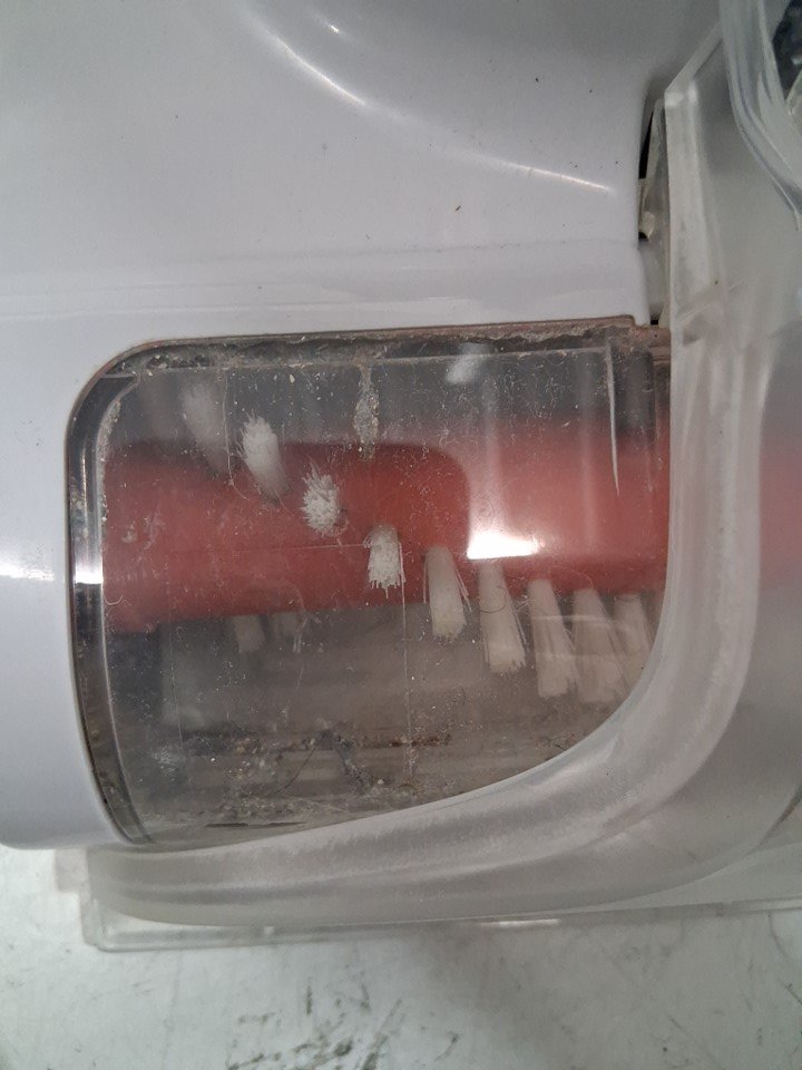 Inside of dust collector has a noticeable dust and dirt residue Some dust and debris in the carpet cleaning spinning brushes Surface stain on handle of device Product was tested for power