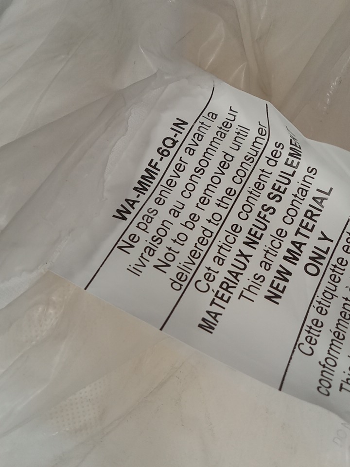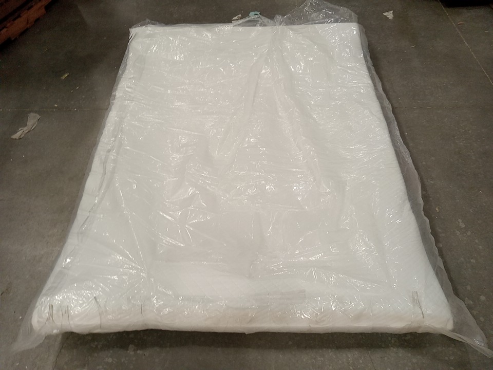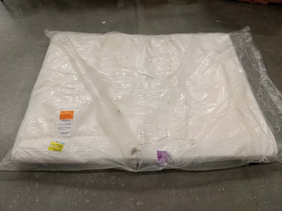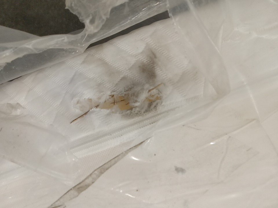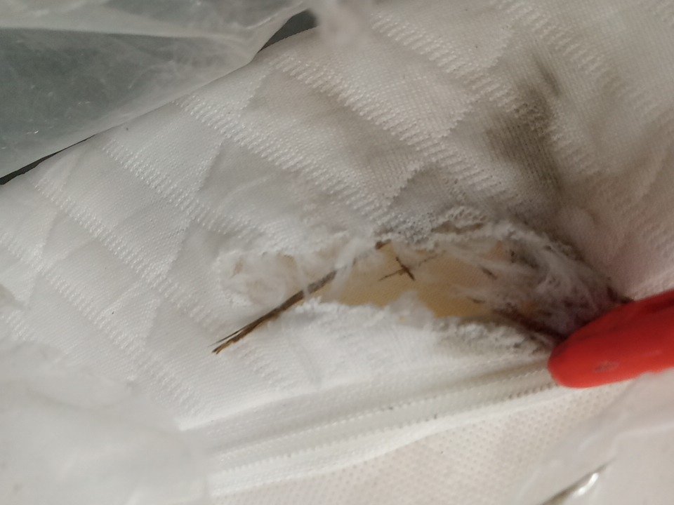 The item appears new, however there are some dirt marks and stains present from shipping/handling as the packaging got damaged. There is a cut underside the mattress as well.