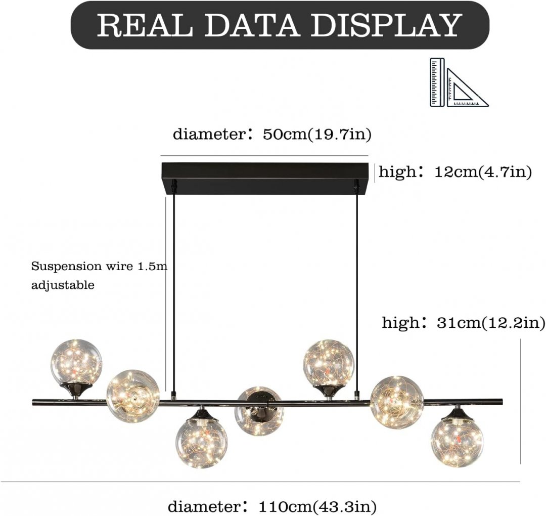 garwarm 7-light dimmable led adjustable-height modern hanging pendant light with glass globes - 43.3" - up to 51" hanging length - 3000k-6000k - 110v - black (model: ‎18301)