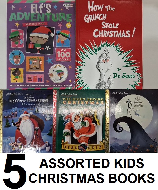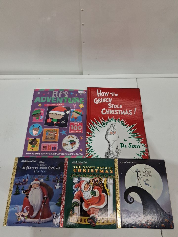5 ASSORTED kids christmas books - the night before christmas, the nightmare before christmas, HOW THE GRINCH STOLE CHRISTMAS, elf's adventure sticker activity book