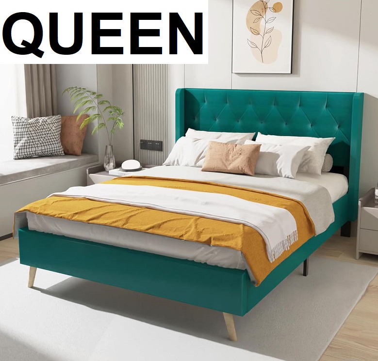 Chenoa Upholstered Platform Bed Frame with Tufted wingback headboard - queen - green (model: