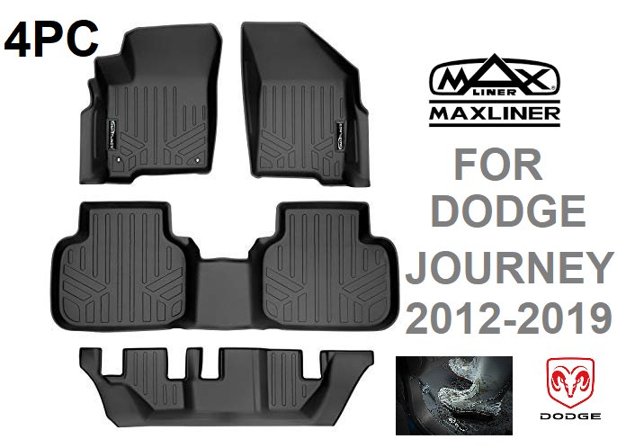 4PC MAXLINER All Weather Custom Fit 3 Row Floor Mat Liner Set - Compatible with 2012-2019 Dodge Journey (Only fits with Front Row Dual Floor Hooks on The Driver Side)- BLACK