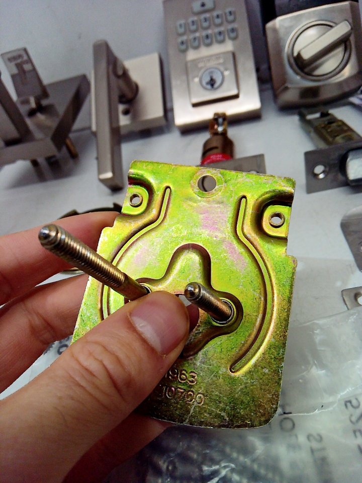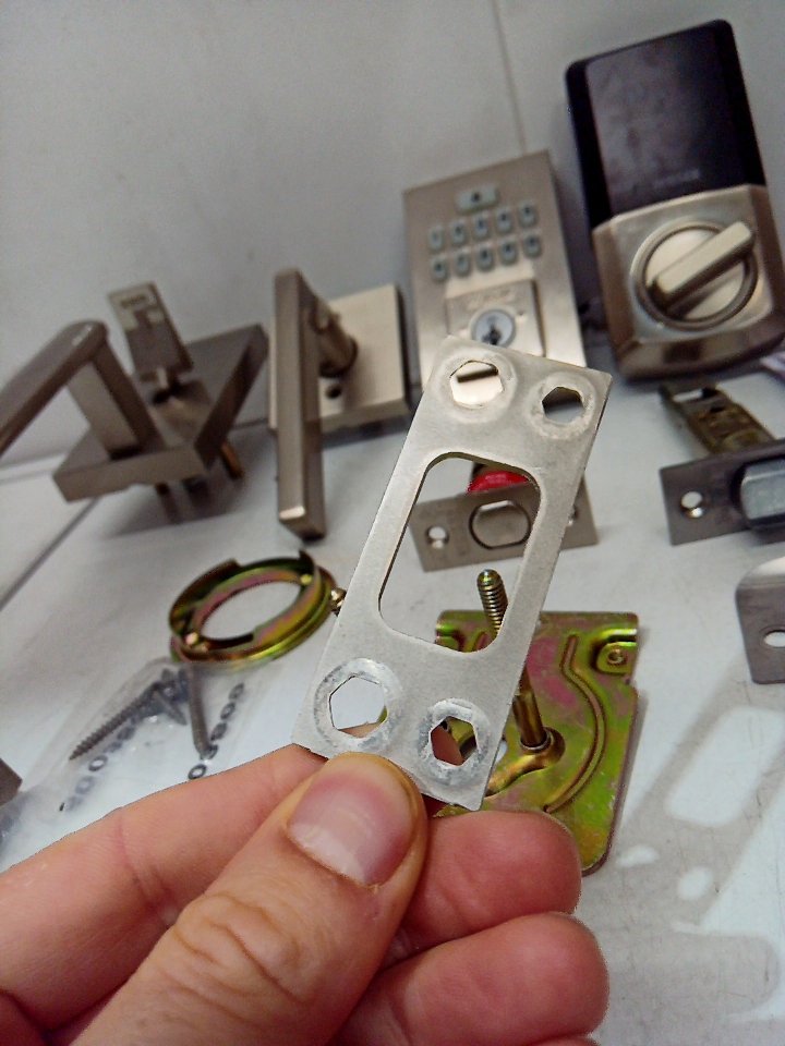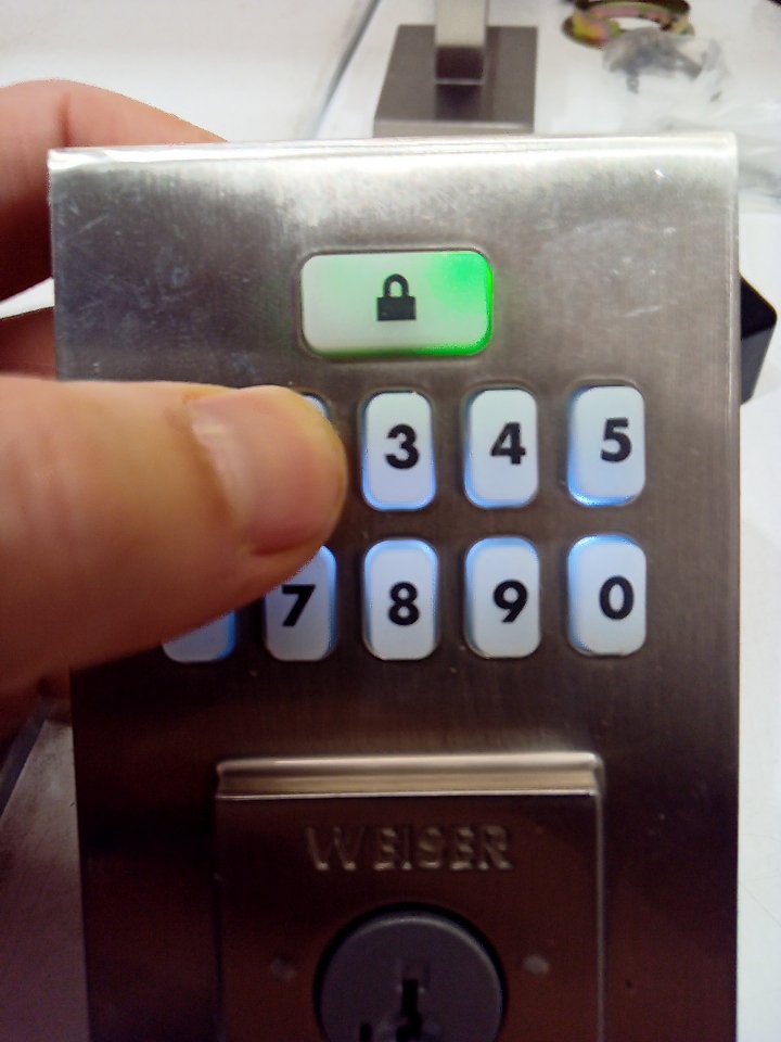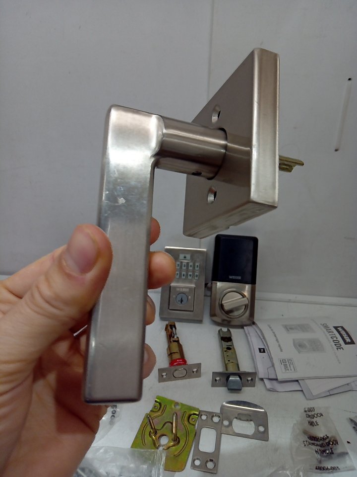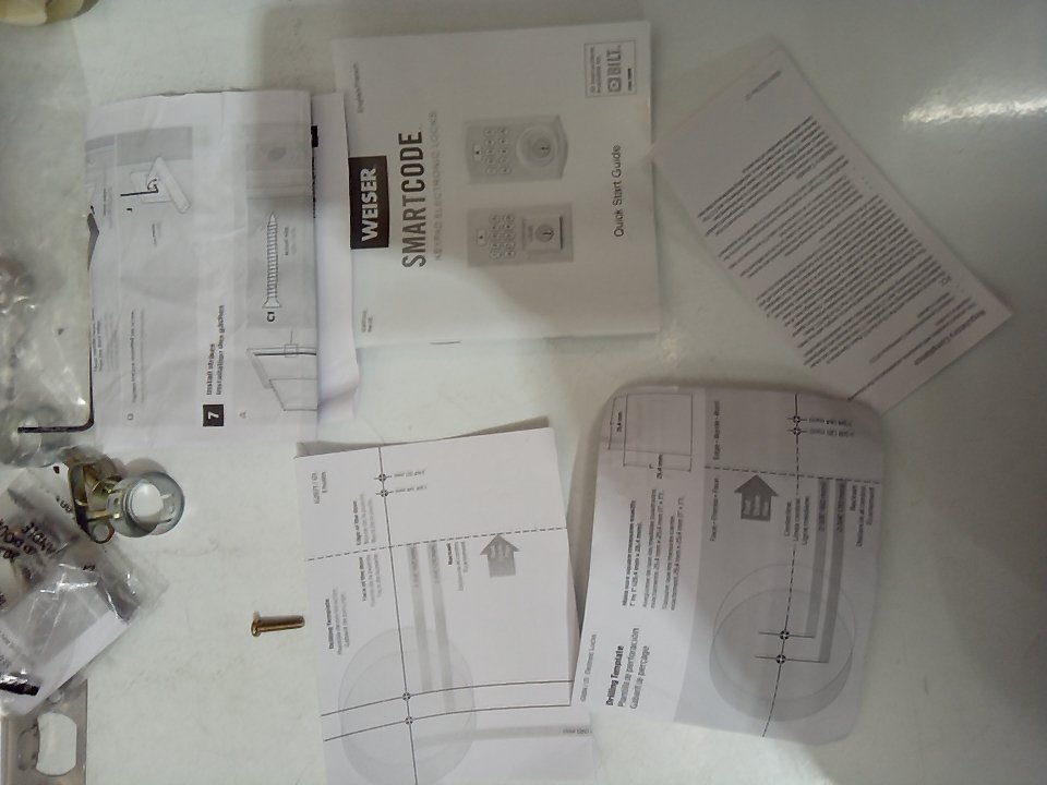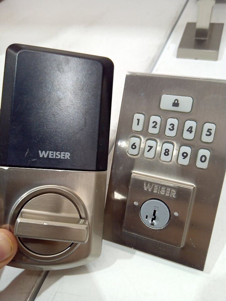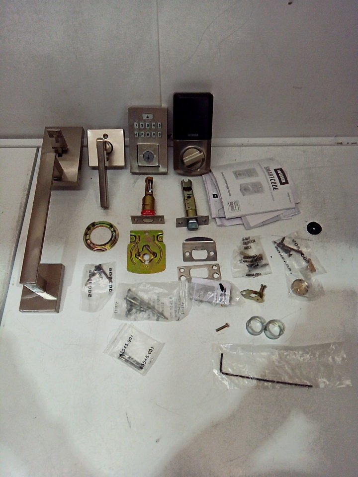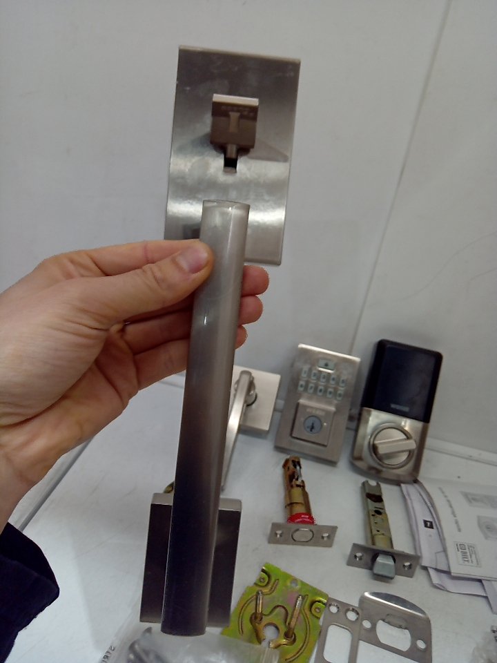 There are scratches, fingerprints and light markings on varous components and around the screw holes on the metal plates from previous installation/use. Ours does not include the keys but can still be unlocked by the keypad. Tested for power. (SEE PHOTOS)