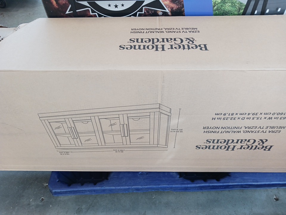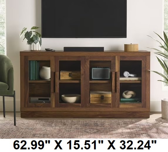 Better Homes & Gardens Ezra TV Stand for TVs with Durable Laminated Wood Construction, Adjustable Open Shelving for Consoles and Media Components, Two Side Cabinets with Hidden Storage and Integrated Cable Management System - Walnut Brown (Model: 441424)