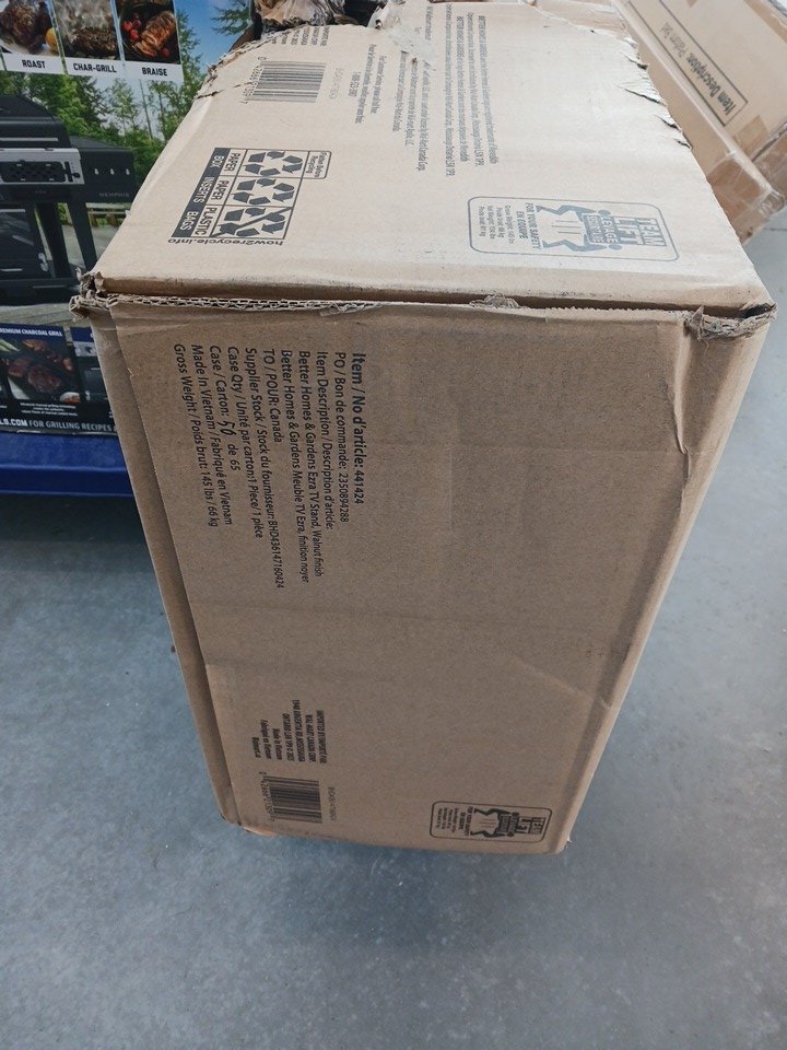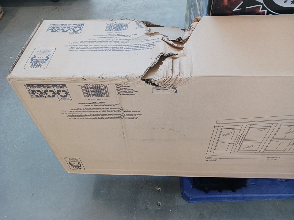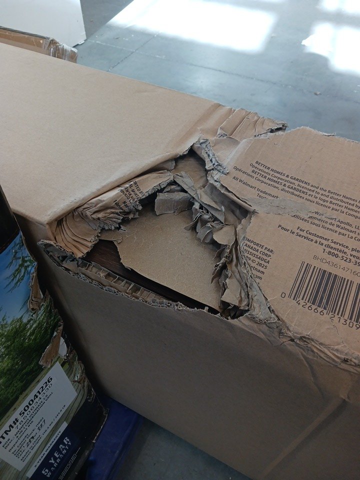 The box has a large tear on one side, which has exposed part of the contents inside. Upon thorough inspection, all the pieces inside are brand new, sealed, and undamaged, including the sections visible through the tear.