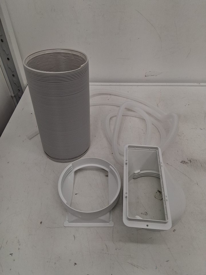 The two window mount pieces have snapped in half due to shipping, should still be functional but may need to be reattached depending on the length needed. The window hose is also somewhat distressed, but all other parts appear present and unused - see photos. Tested for power.
