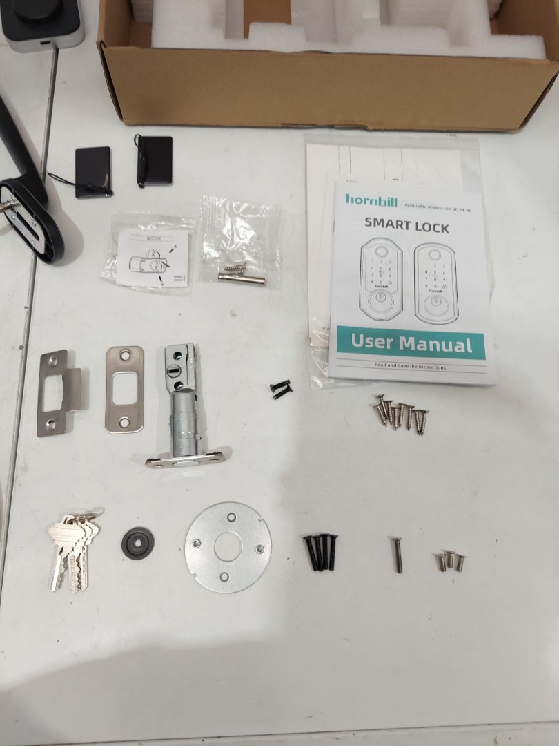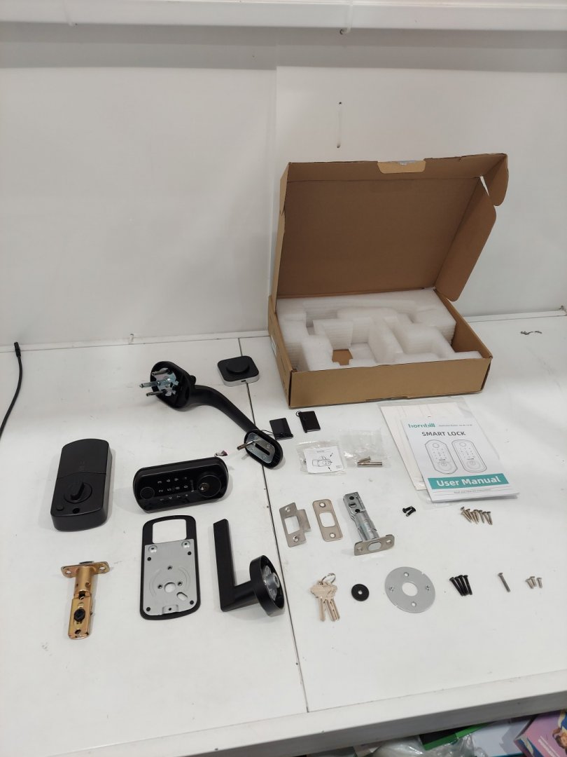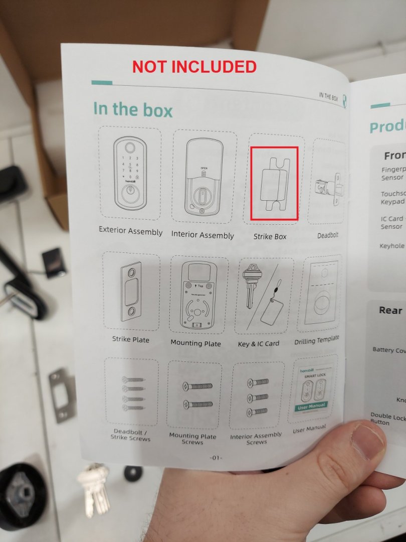 Item arrived loosely packaged with signs of light prior use. there are smudges and minor cosmetic scratches on the keypad. Additionally this item arrived without the strike-box and some of the generic installation hardware but these can be replaced and all essential pieces appear to be included.