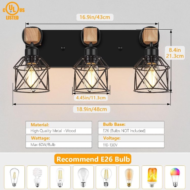 Lomoky 3-light wood bathroom vanity light fixture - 18.9" x 8.4" - black - (Model: jnx-005-3)