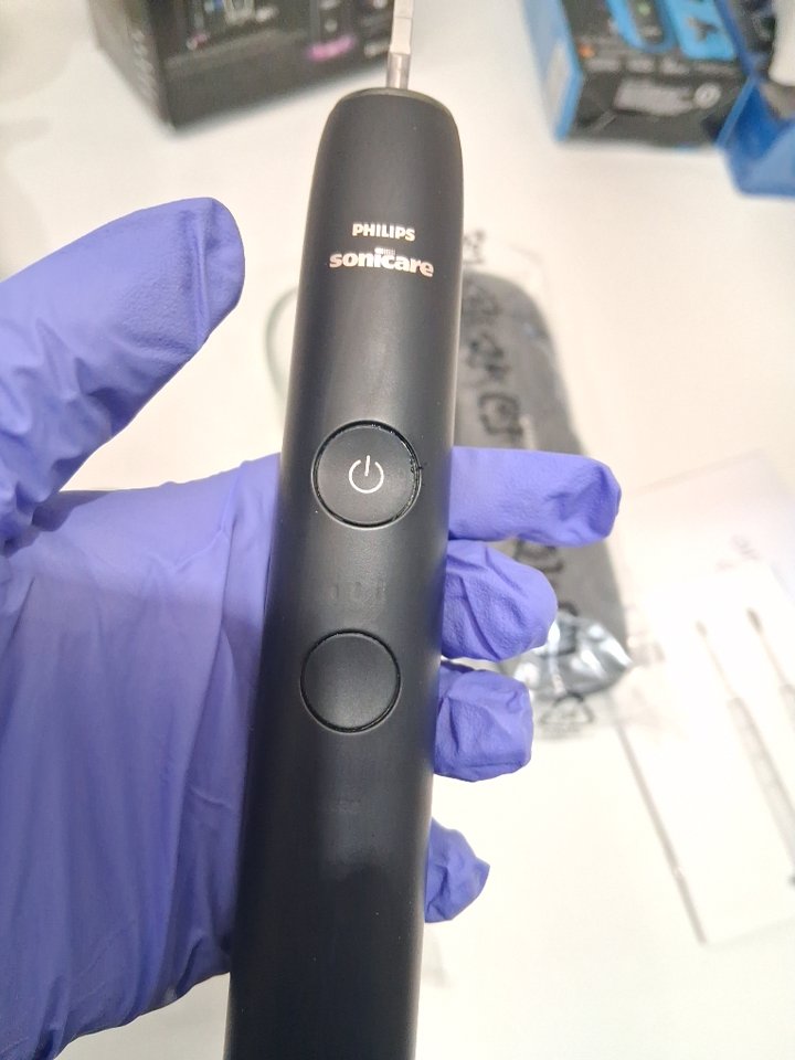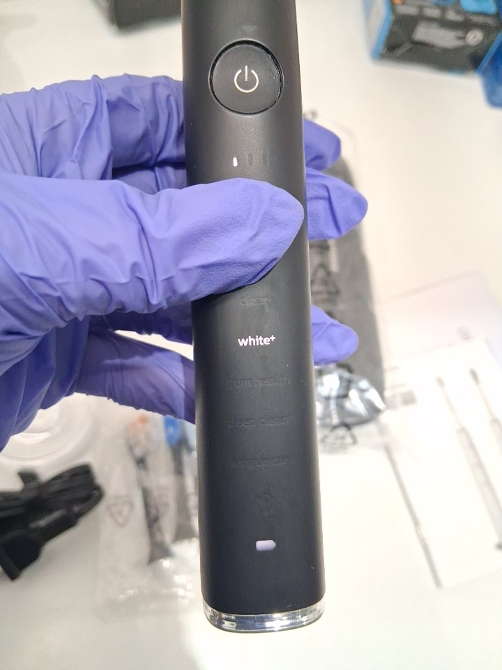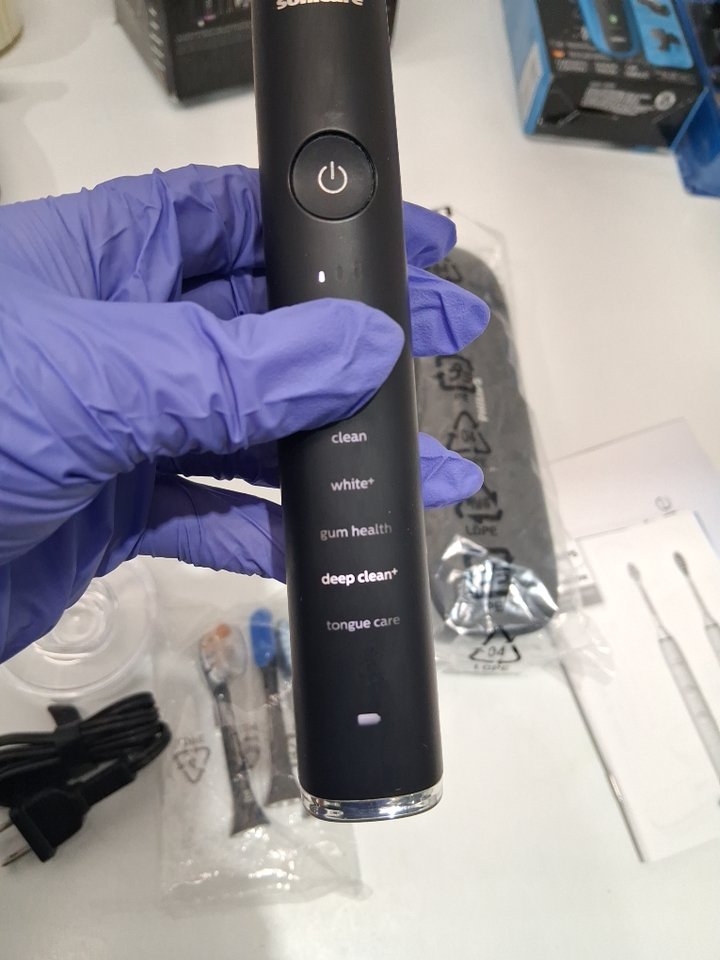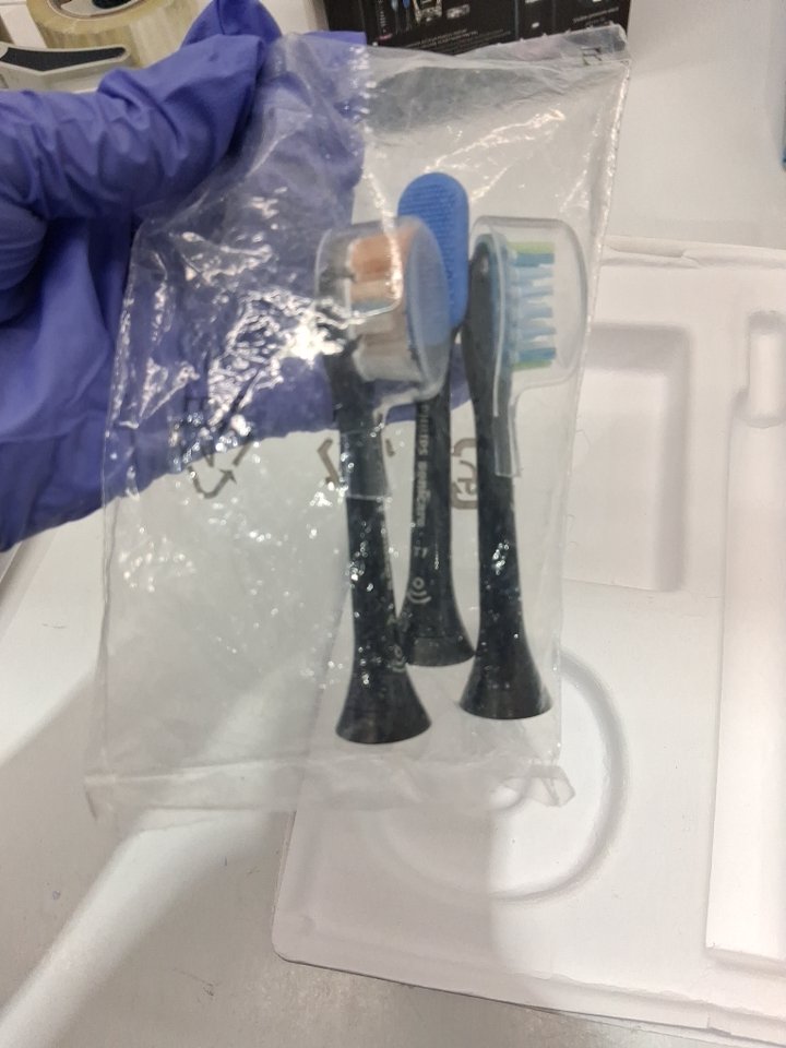 There is a bit of toothpaste residue on the brush handle Please note that we have included a sealed head brush. deep cleaning is also recommended.
