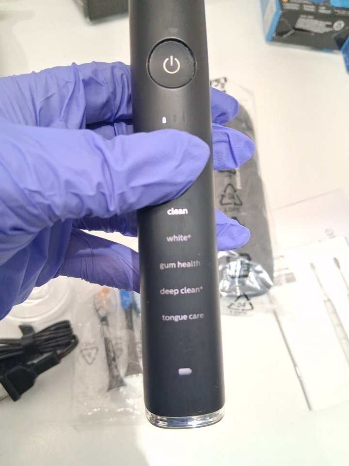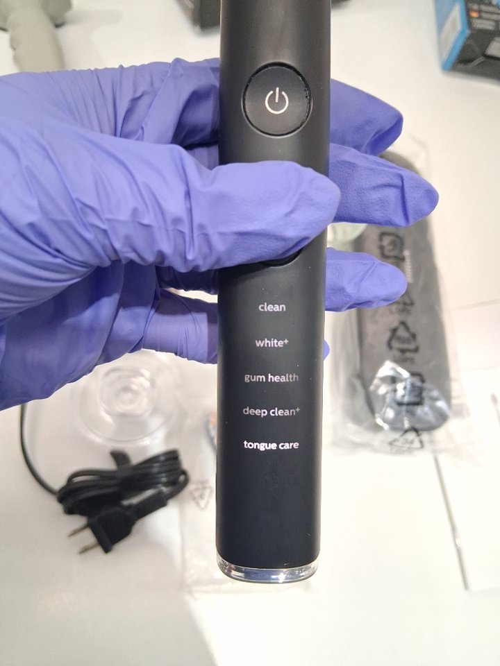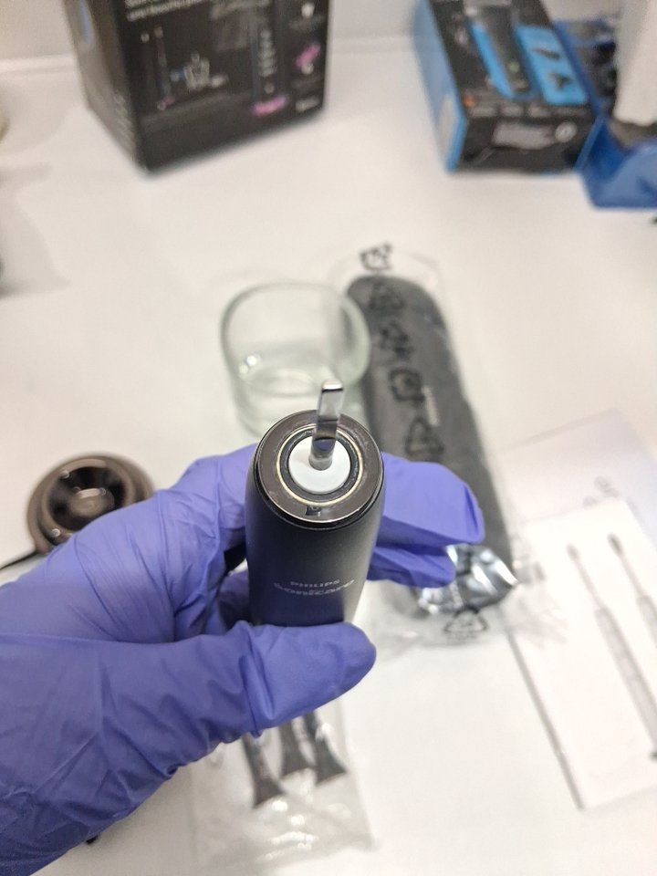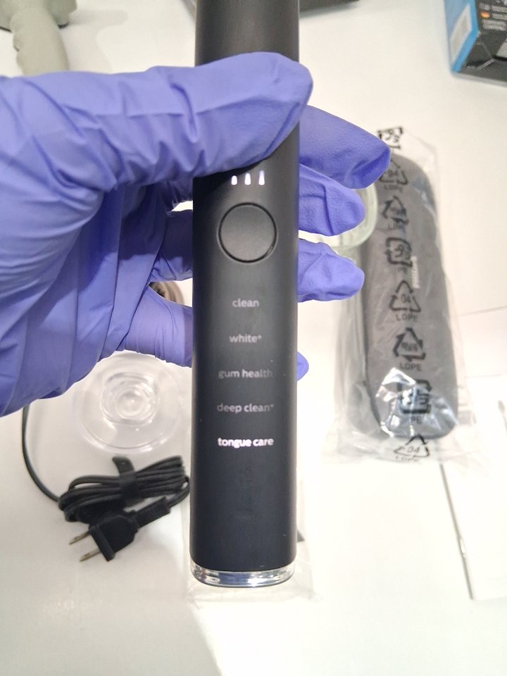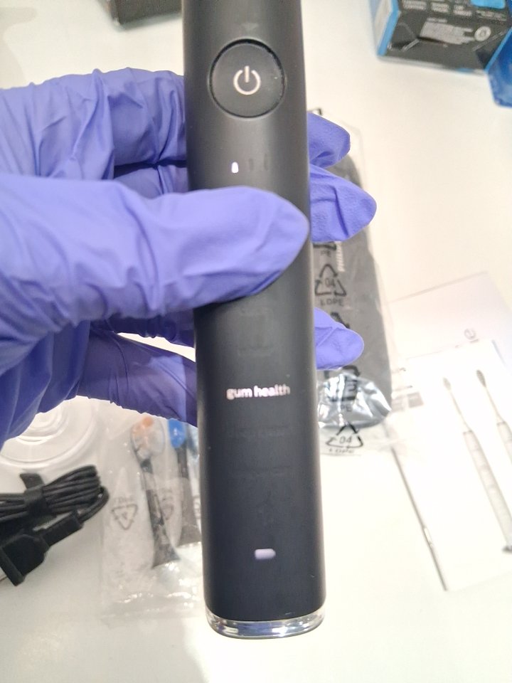 There is a bit of toothpaste residue on the brush handle Please note that we have included a sealed head brush. deep cleaning is also recommended.
