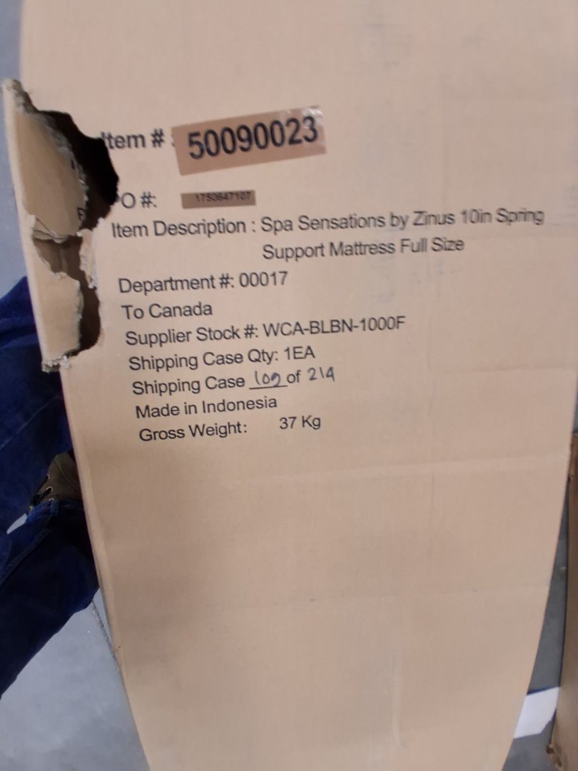ZINUS SPA 10" SENSATIONS SUPPORT SPRING MATTRESS - FULL (MODEL: WCA-BLBN-1000F)