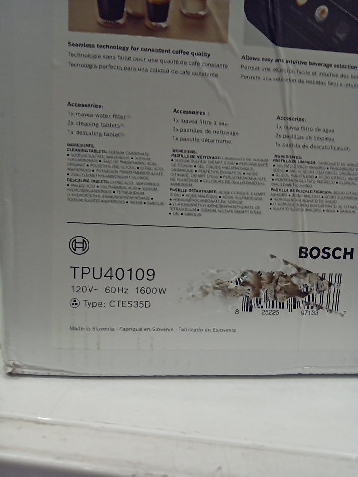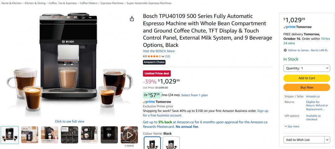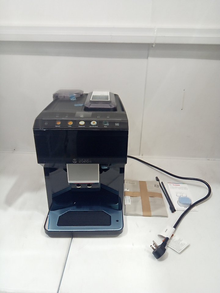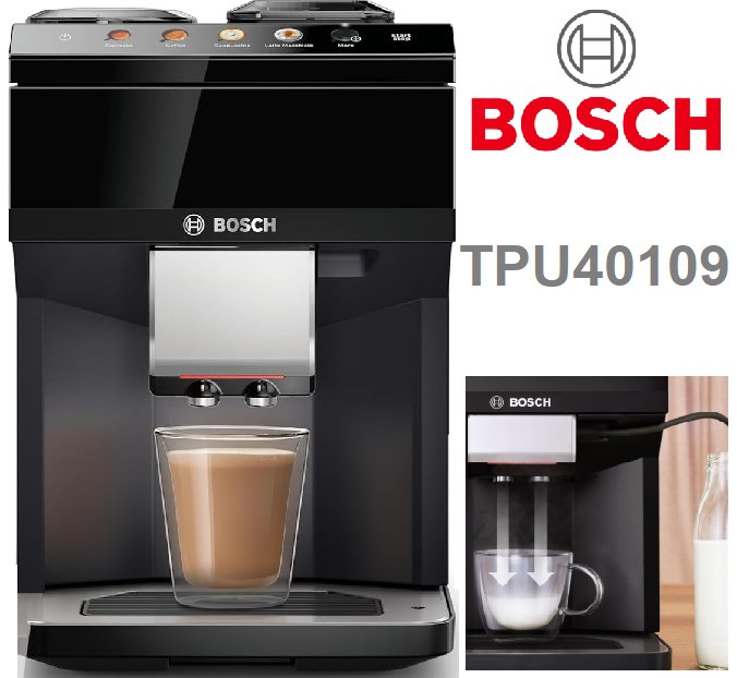 BOSCH 500 SERIES FULLY AUTOMATIC ESPRESSO MACHINE WITH WHOLE BEAN COMPARTMENTS AND GROUND COFFEE CHUTE - TFT DISPLAY AND TOUCH CONTROL PANEL - EXTERNAL MILK SYSTEM - 9 BEVERAGE OPTIONS - BLACK (MODEL: TPU40109)