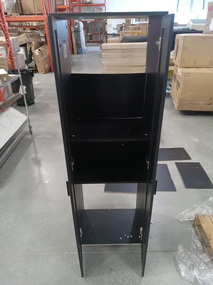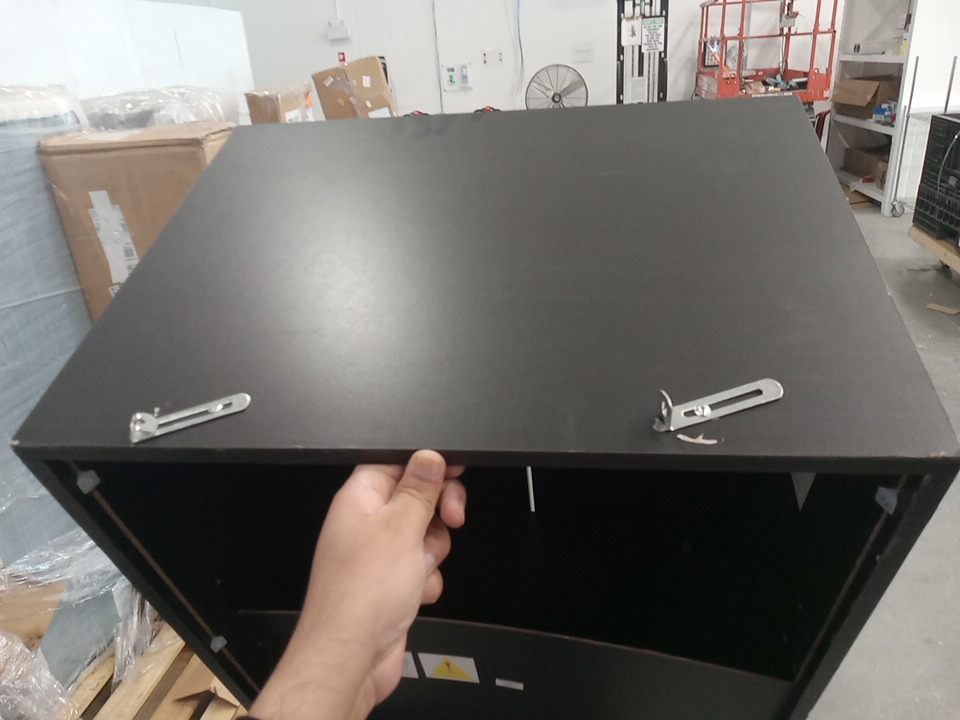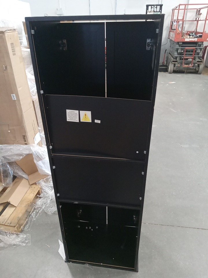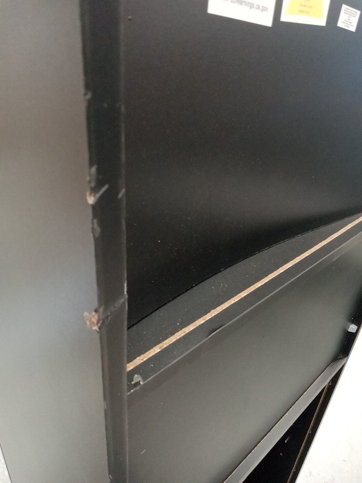 Item has been previously built and is missing some hardware. The back panel/ply are damaged and are loose which will require additional hardware for assembly. There is multiple scuffing and chipping present on the cabinet from loose shipping/storage. The cabinet needs to fixed as the frame is lightly loose.