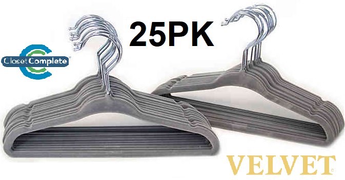 25PK CLOSET COMPLETE PREMIUM KID SIZED VELVET HANGERS - SILVER HOOKS/GREY VELVET HANGERS