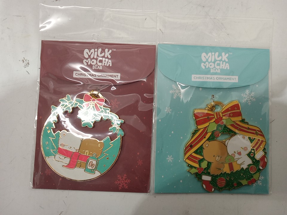 2 MILK MOCHA bears enamel Christmas ORNAMENT - 3" - hugging present and sharing scarf