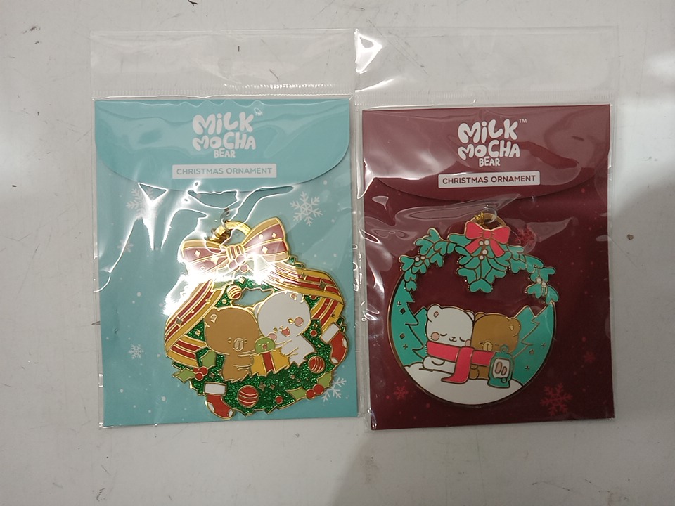 2 MILK MOCHA bears enamel Christmas ORNAMENT - 3" - hugging present and sharing scarf