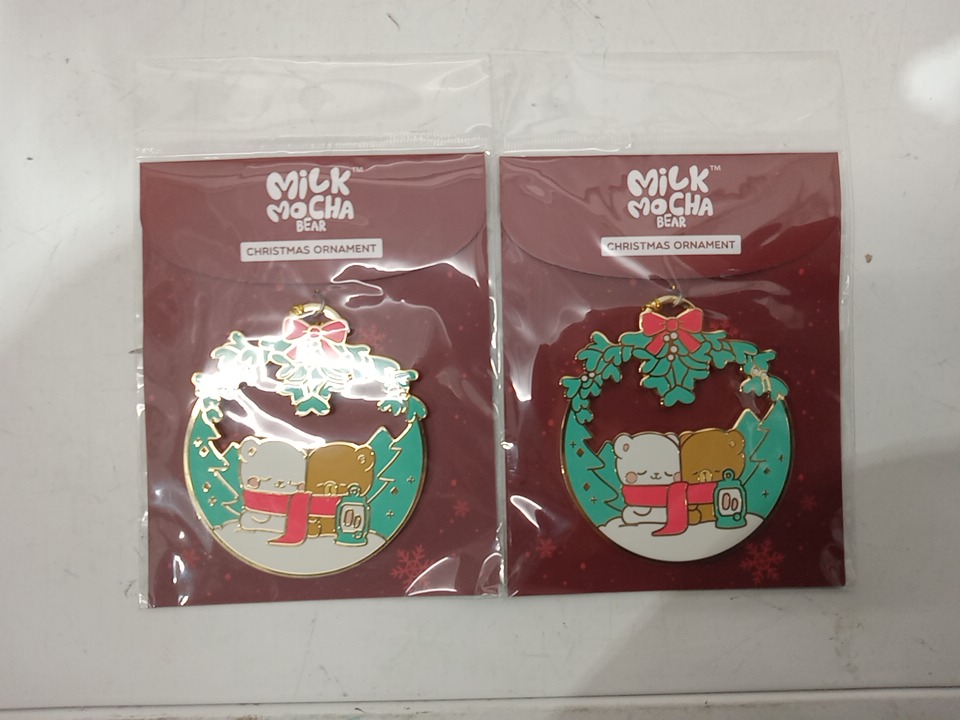 2 MILK MOCHA bears enamel Christmas ORNAMENT - 3" - sharing scarf