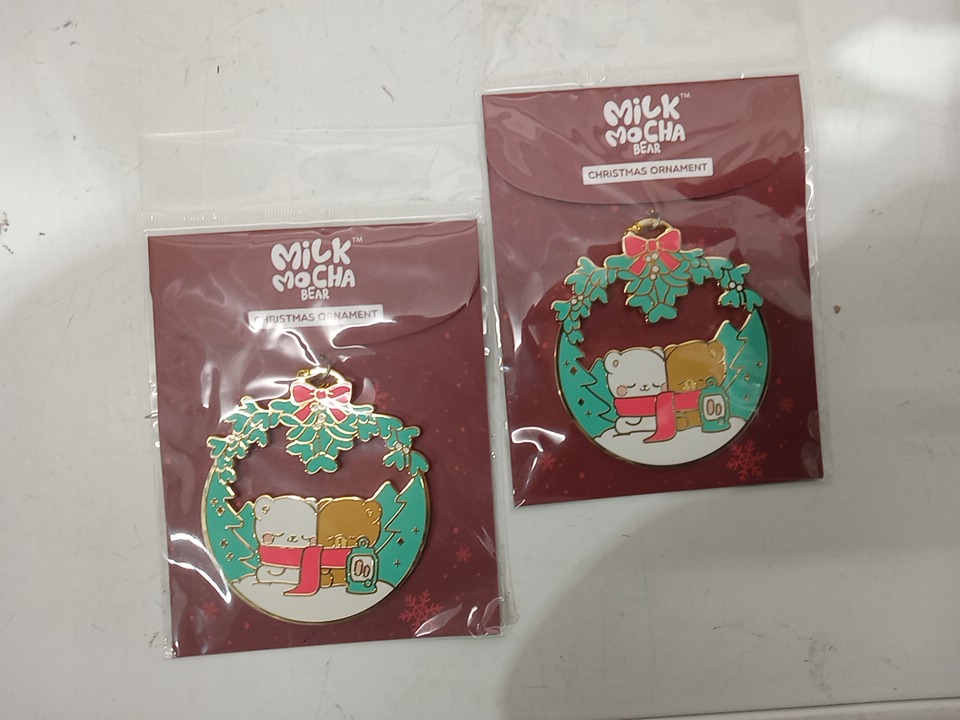 2 MILK MOCHA bears enamel Christmas ORNAMENT - 3" - sharing scarf