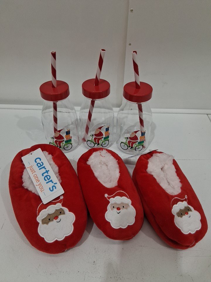6 ASSORTED christmas milk bottles and toddler slippers - (3) bicycle santa bottles with straws / (3pr) carters santa slipper socks 2t-5t