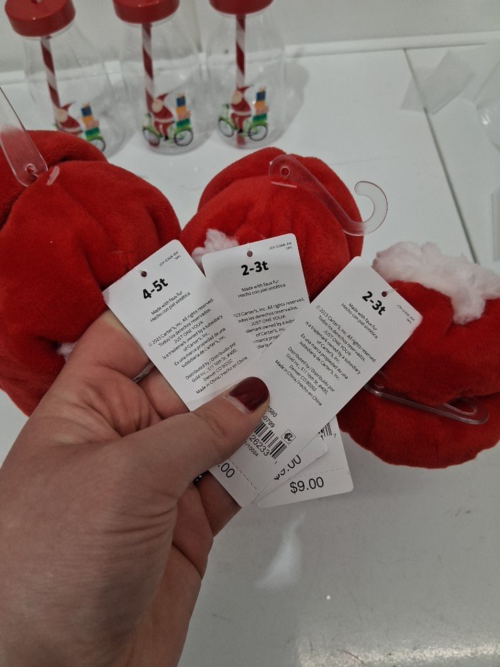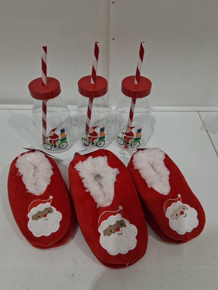 6 ASSORTED christmas milk bottles and toddler slippers - (3) bicycle santa bottles with straws / (3pr) carters santa slipper socks 2t-5t