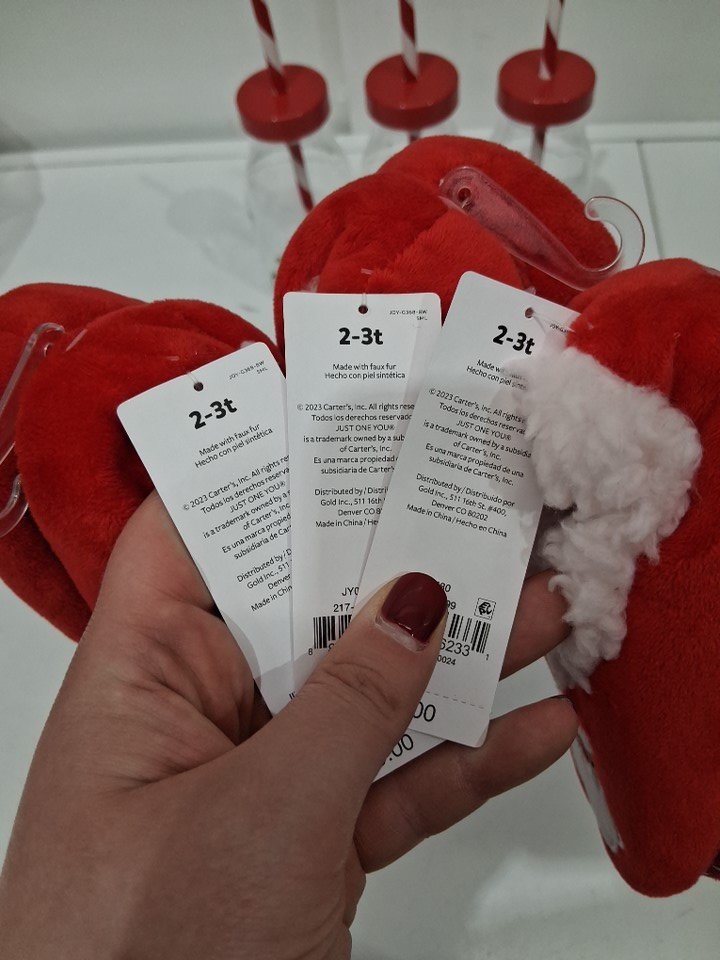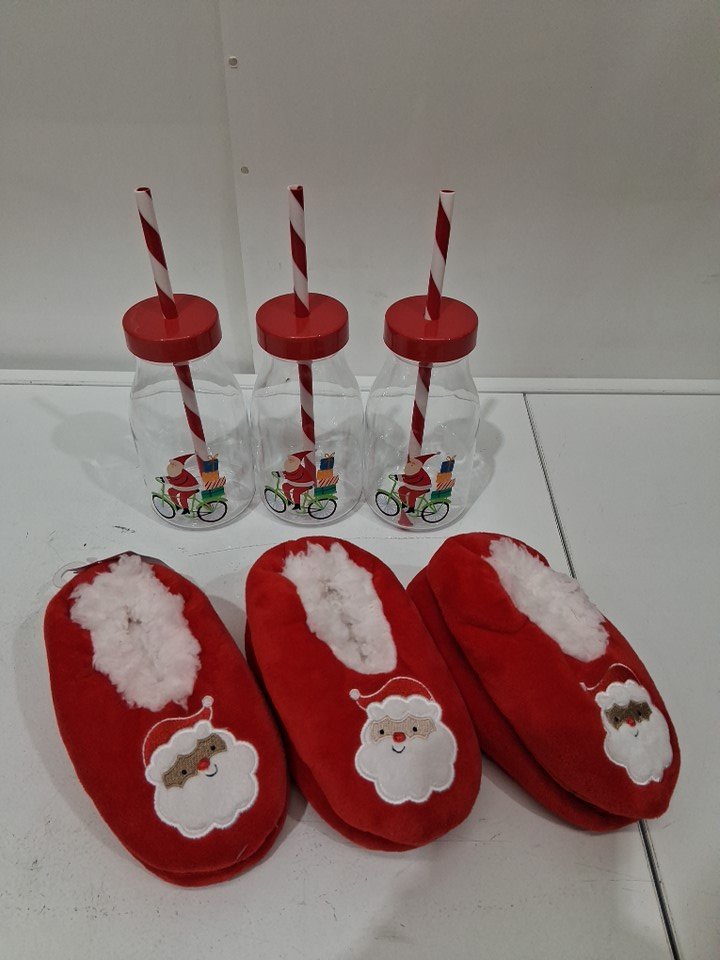 6 ASSORTED christmas milk bottles and toddler slippers - (3) bicycle santa bottles with straws / (3pr) carters santa slipper socks 2t-3t