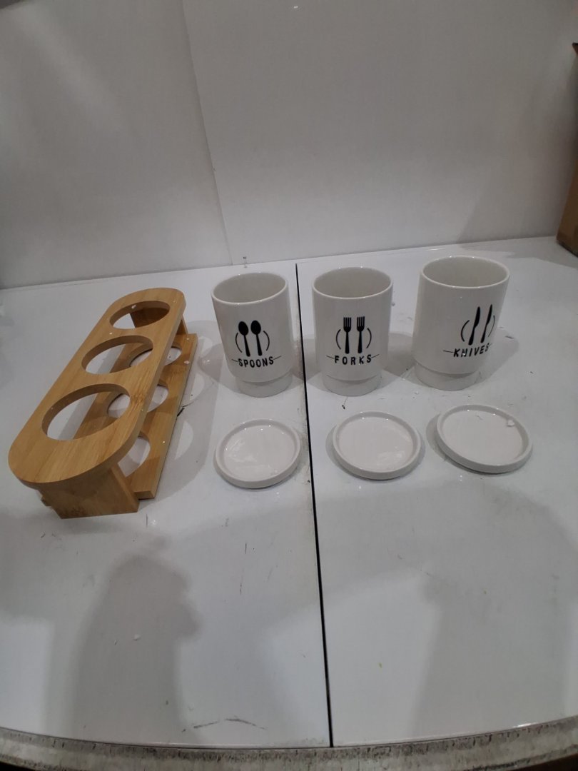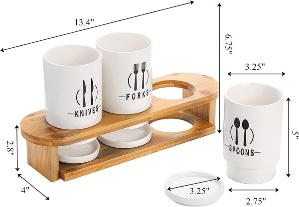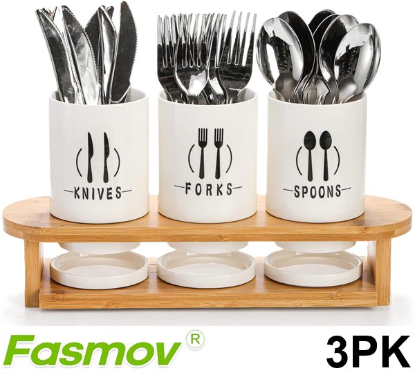 3PK Fasmov Ceramic Cutlery HolderS with Bamboo Rack - 13.4" X 6.75" X 4" - WHITE/BLACK/BAMBOO