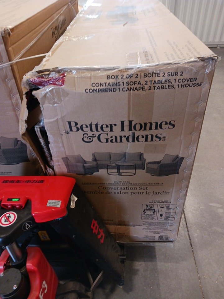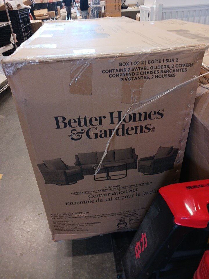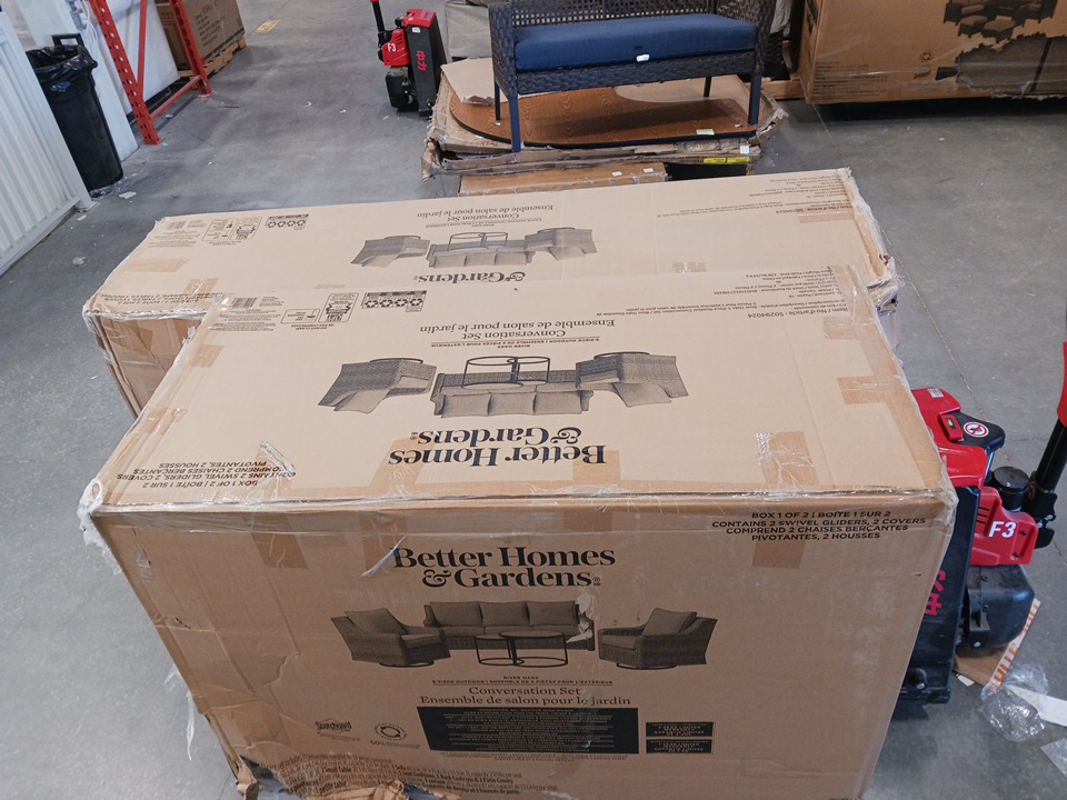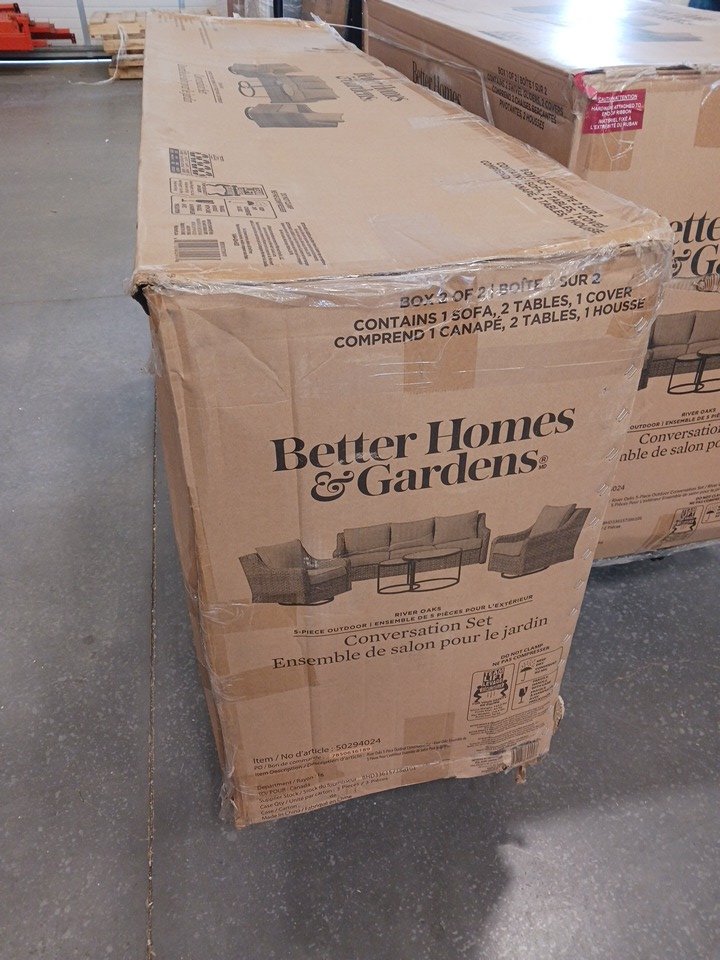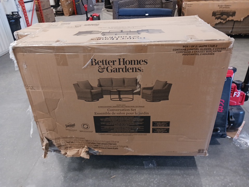 5PC Better Homes & Gardens River Oaks Patio Outdoor Conversation Set – Includes One Sofa, Two Swivel Chairs, and Two Nesting Tables with Durable Tempered Glass Tops with Patio Covers - Beige (Model: 50294024)