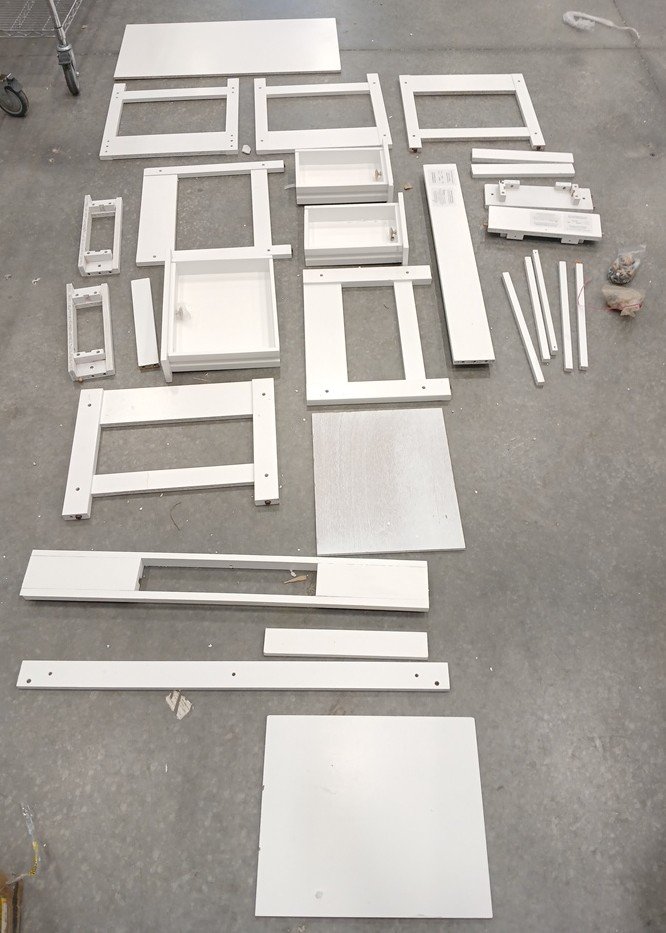 Our item has a crack on one of the small boards, but it appears to be cosmetic. Some of the pieces have scuffs to their corners. Additional hardware may be required