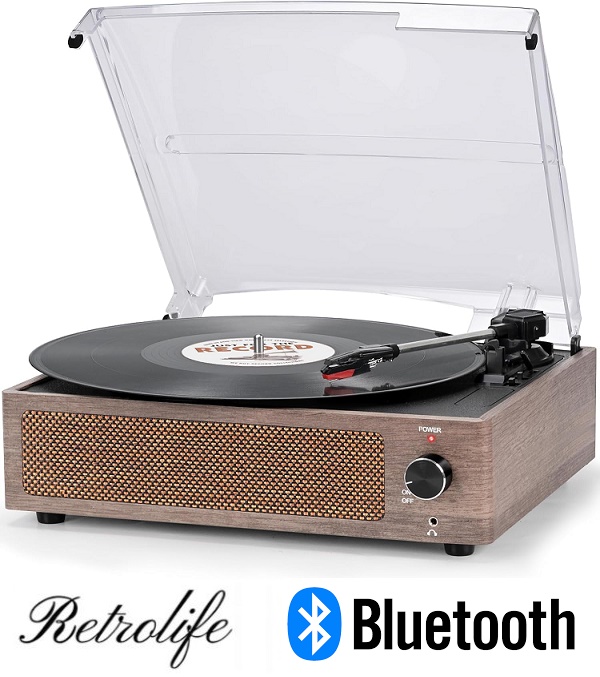 Retrolife Vintage Style Record Player Turntable with Built-in Speakers, Bluetooth, USB Port, AUX Input, and RCA Output - 3 Speeds - Gray Wood (Model: R608)