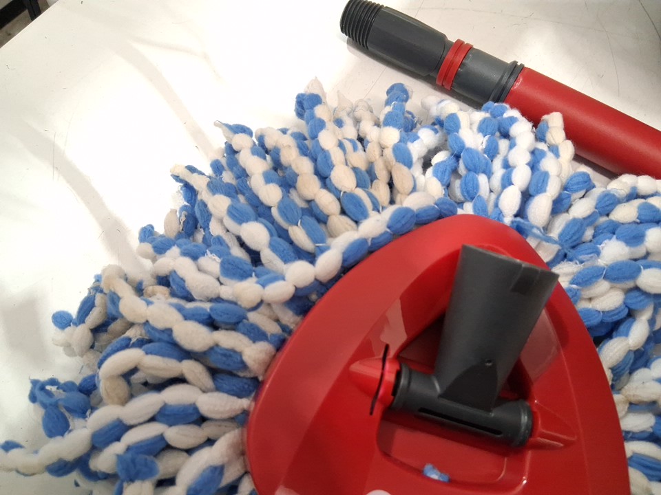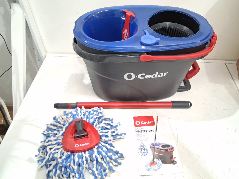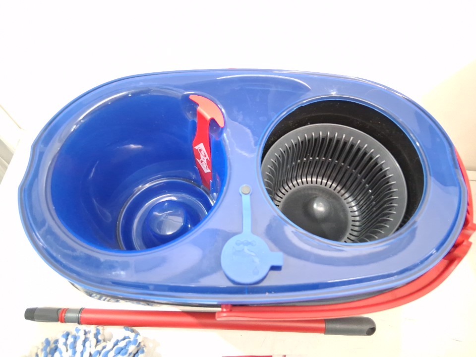 mop head has dirt and hair in it and mop bucket has water marks and dirt on it from previous use - see photos